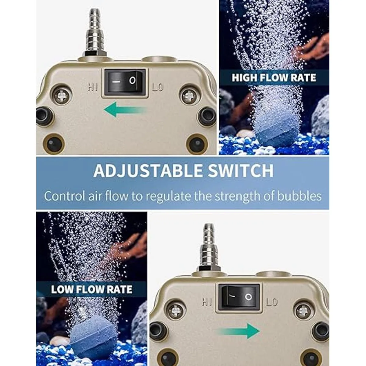 Flujo de aire ajustable: el interruptor de modo ajustable en la parte inferior regula libremente la salida de aire baja o alta. Satisface enormemente el flujo de aire deseado para oxigenar completamente tu pecera.