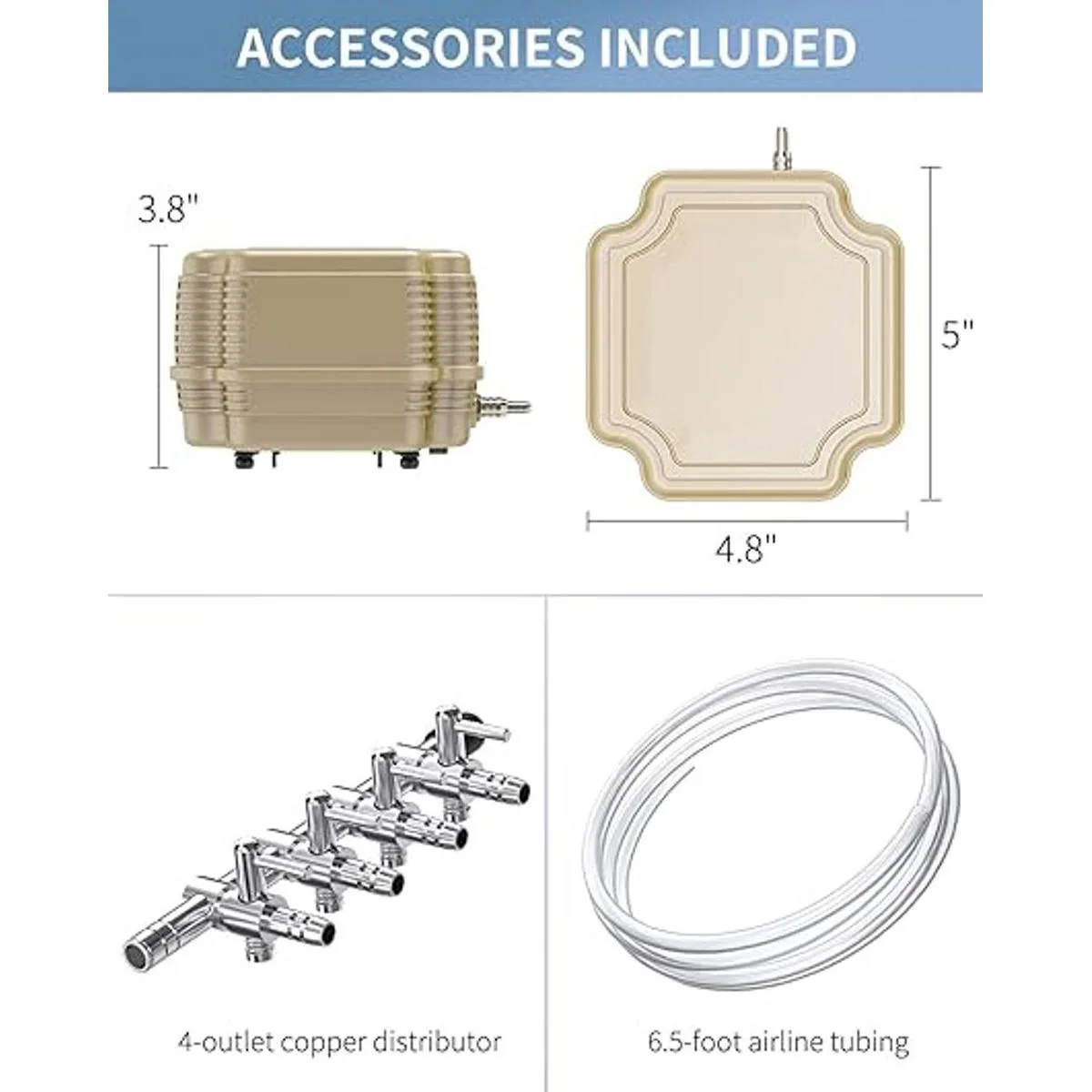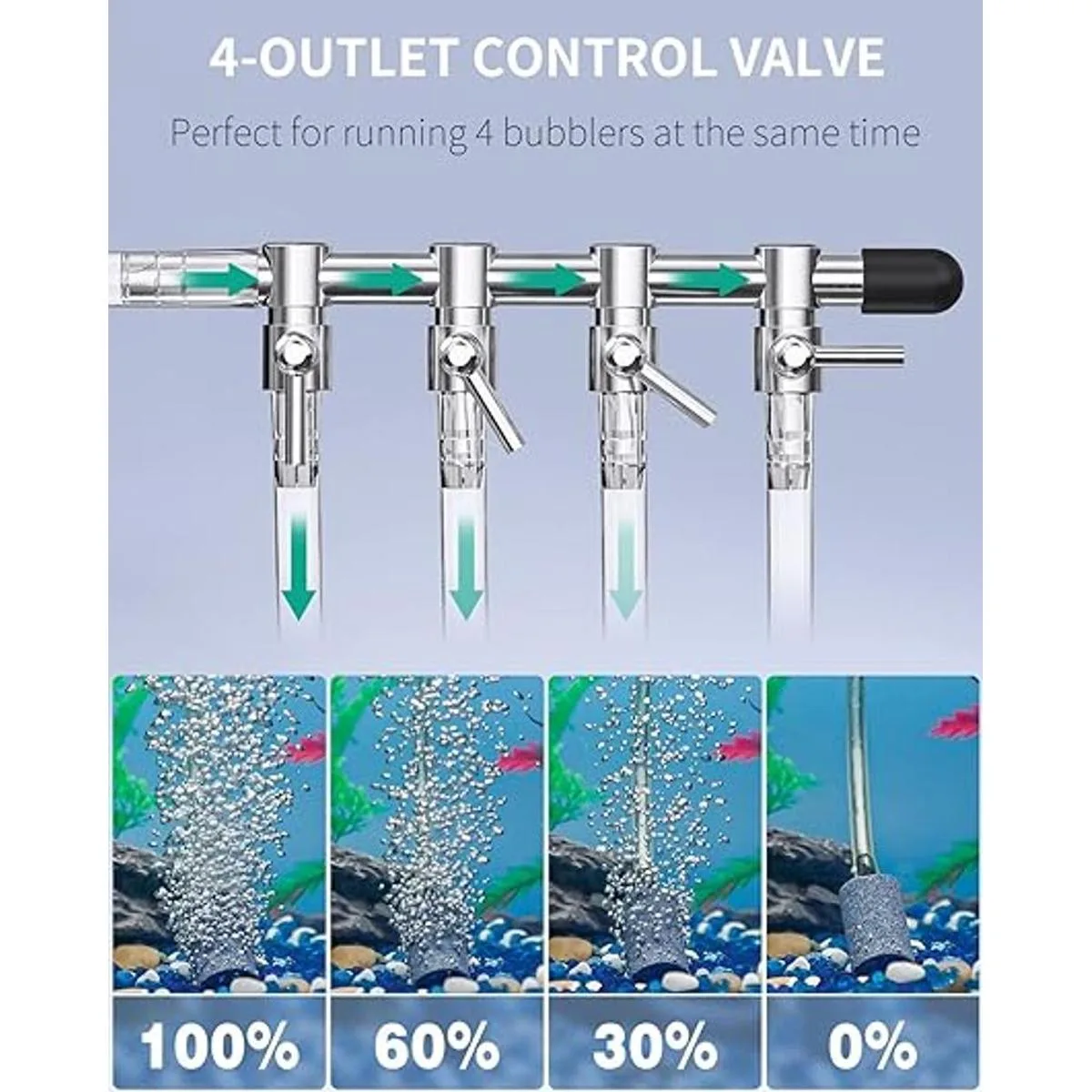 4 puertos de salida: viene con un distribuidor de cobre de 4 salidas para controlar manualmente el flujo de aire para tus múltiples necesidades. Perfecto para ejecutar 4 filtros o piedras de aire al mismo tiempo.