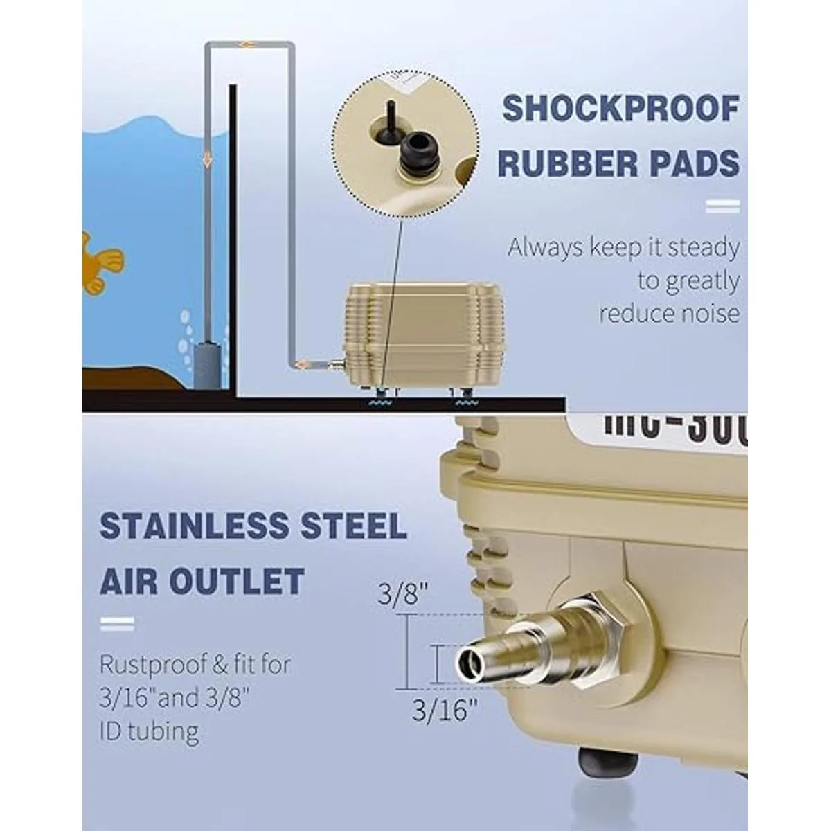 Fuerte salida: suministra 254 galones de flujo de aire constante por hora con bajo consumo de energía. Adecuado para aireación en estanques grandes o jardines acuáticos de hasta 300 galones.
