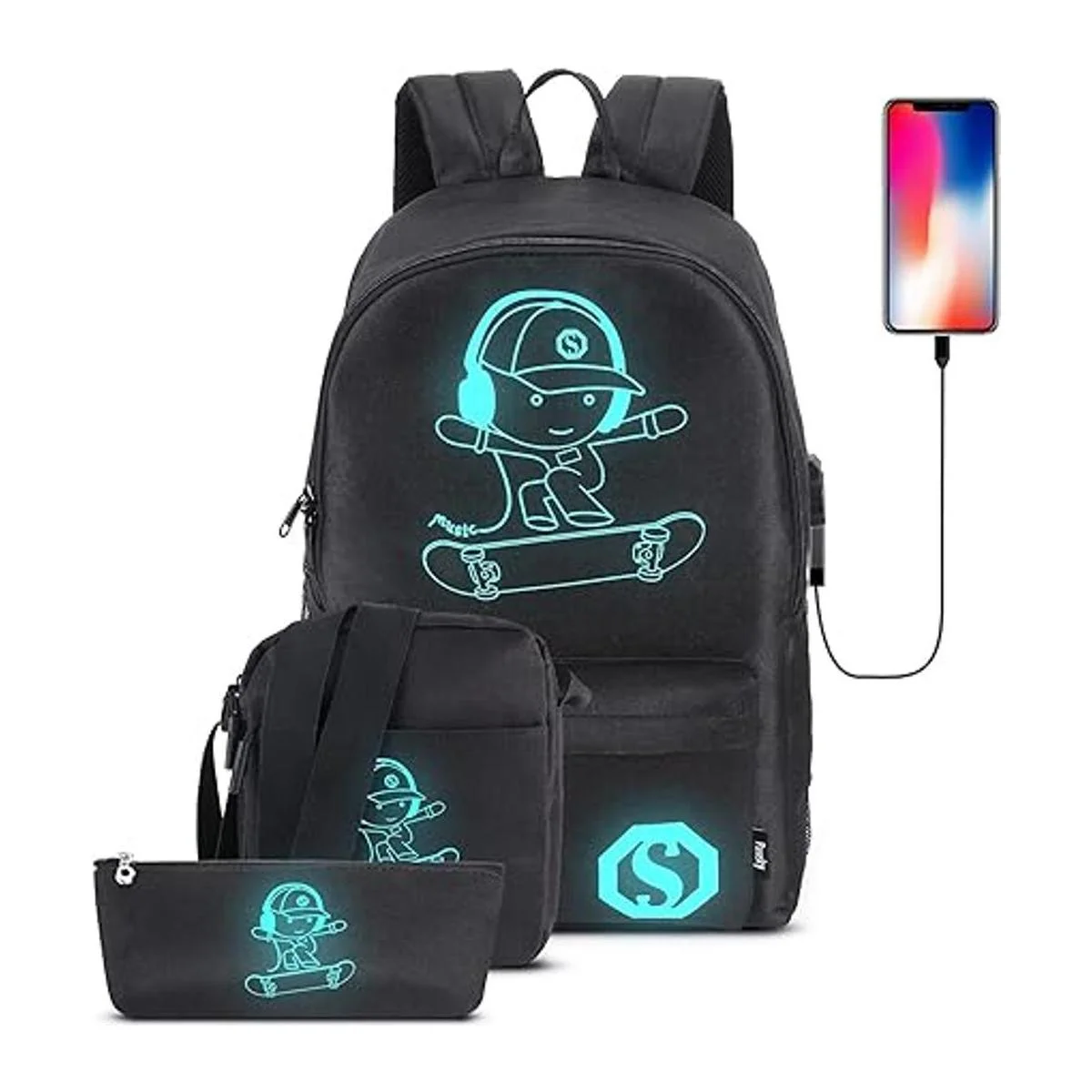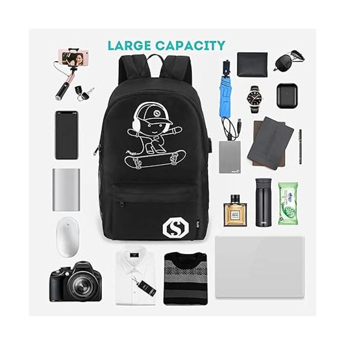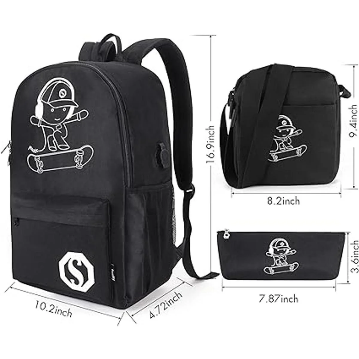Pawsky Mochila escolar luminosa de anime para monopatín con puerto de carga USB, bloqueo antirrobo, bolsa de cabestrillo y estuche para lápices para adolescentes, niños y niñas, mochila escolar universitaria ligera para laptop, color negro