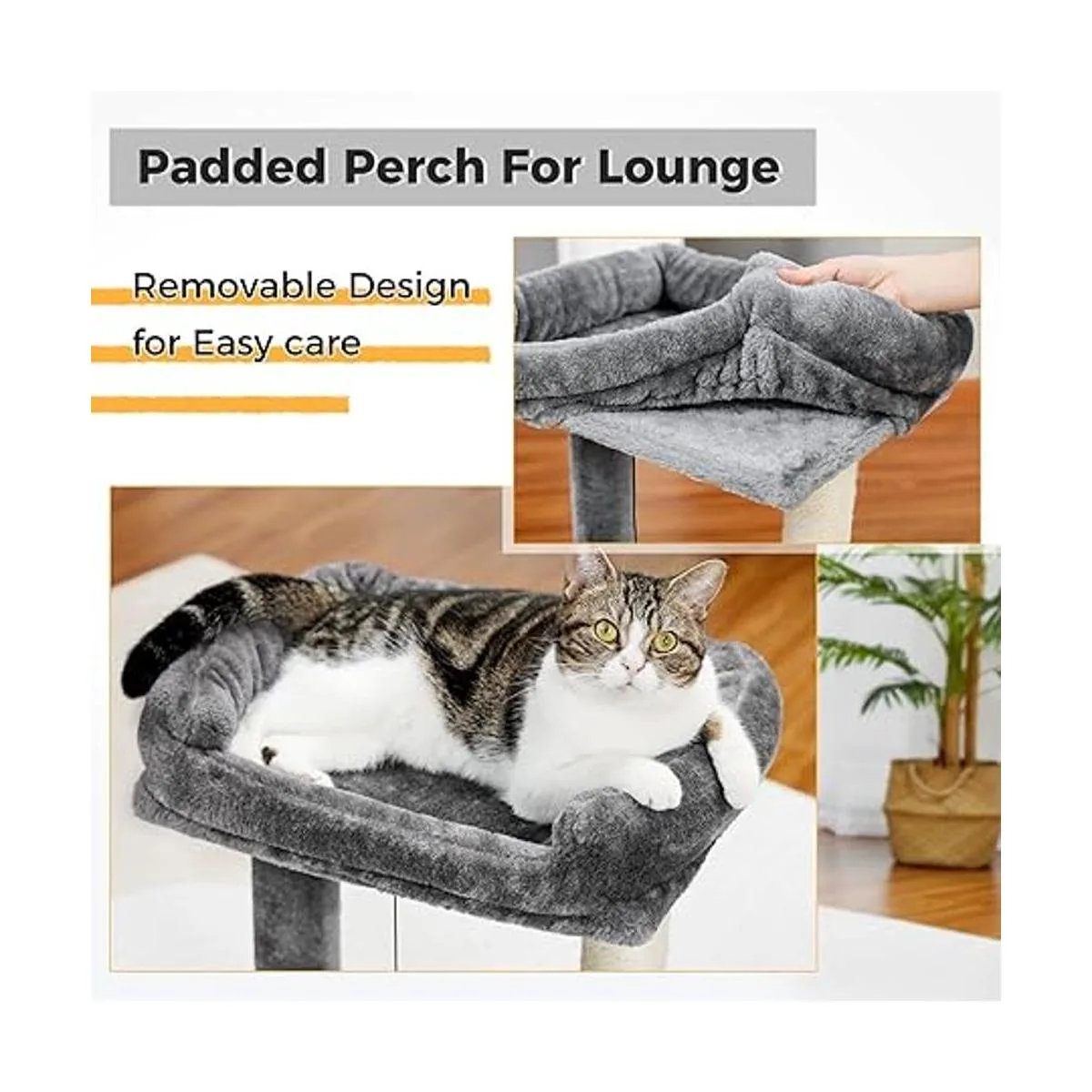 Versión mejorada: el poste rascador con percha es el último diseño de nuestra almohadilla original para rascar. Continúa sus ventajas originales para ahorrar espacio mientras añade una percha acolchada súper grande en su parte superior para proporcionar un espacio de descanso para los felinos.