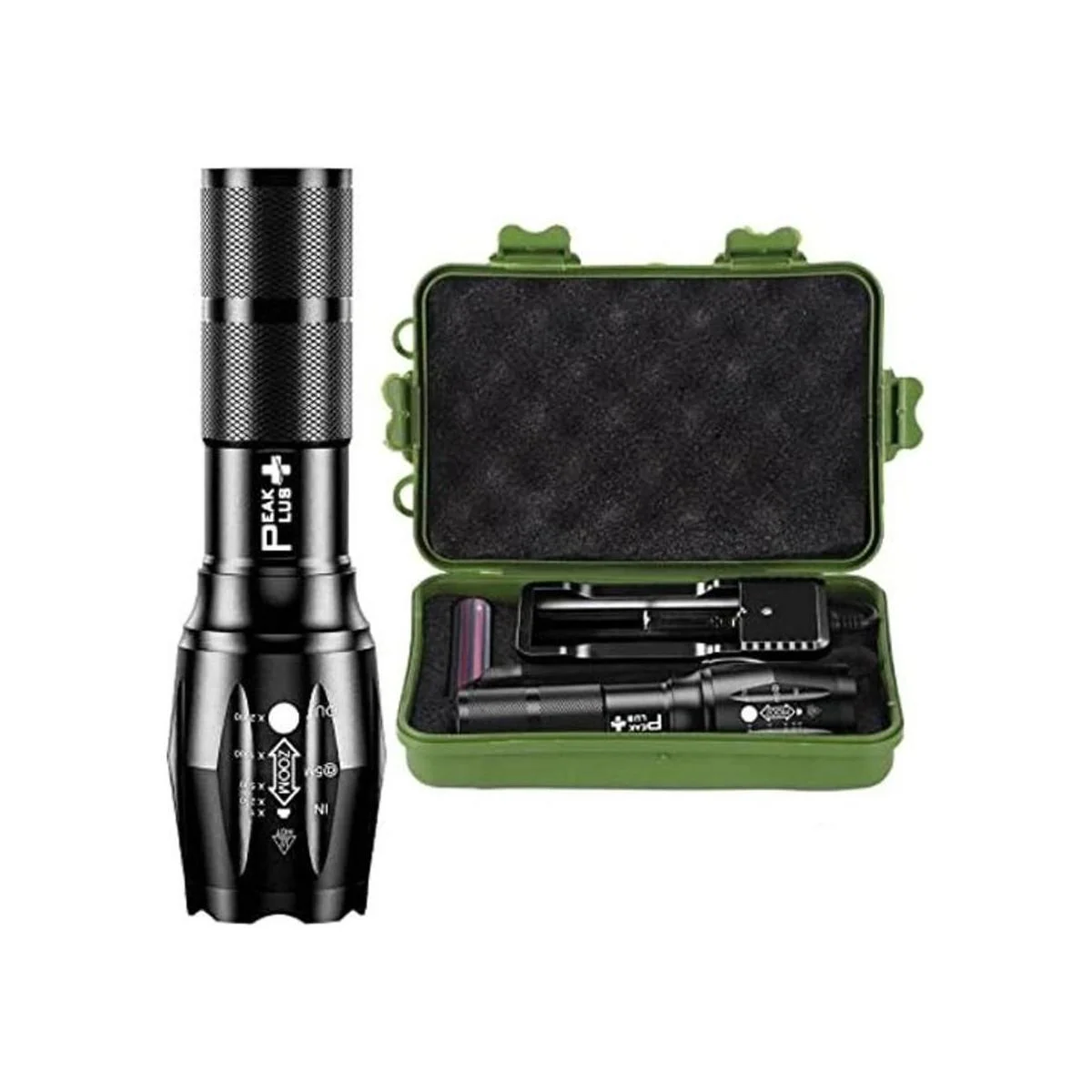 PeakPlus Linterna táctica con luz led ultrabrillante con enfoque ajustable y función de zoom, con 5 modos, resistente al agua, con batería de ion de litio 18650 recargable y cargador.
