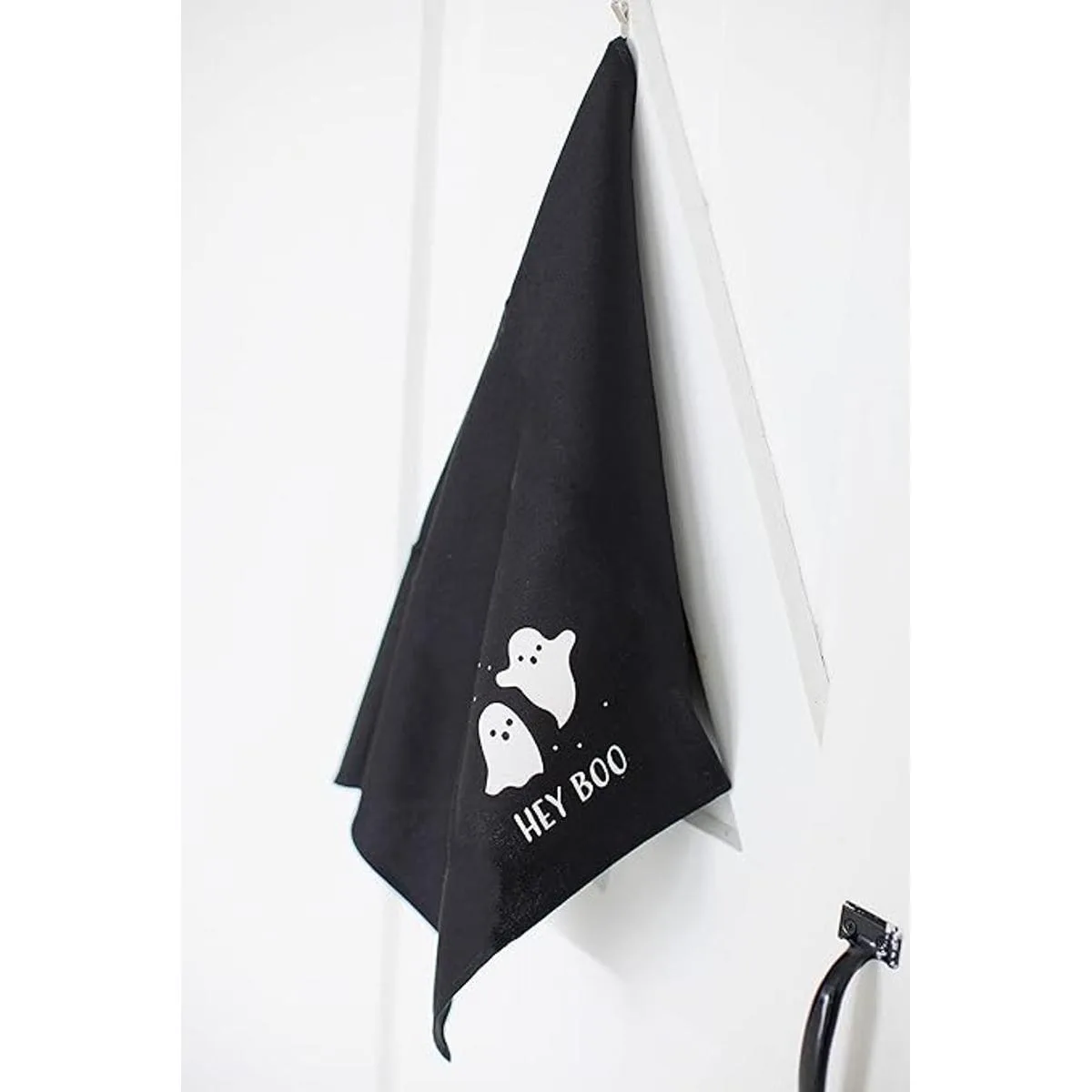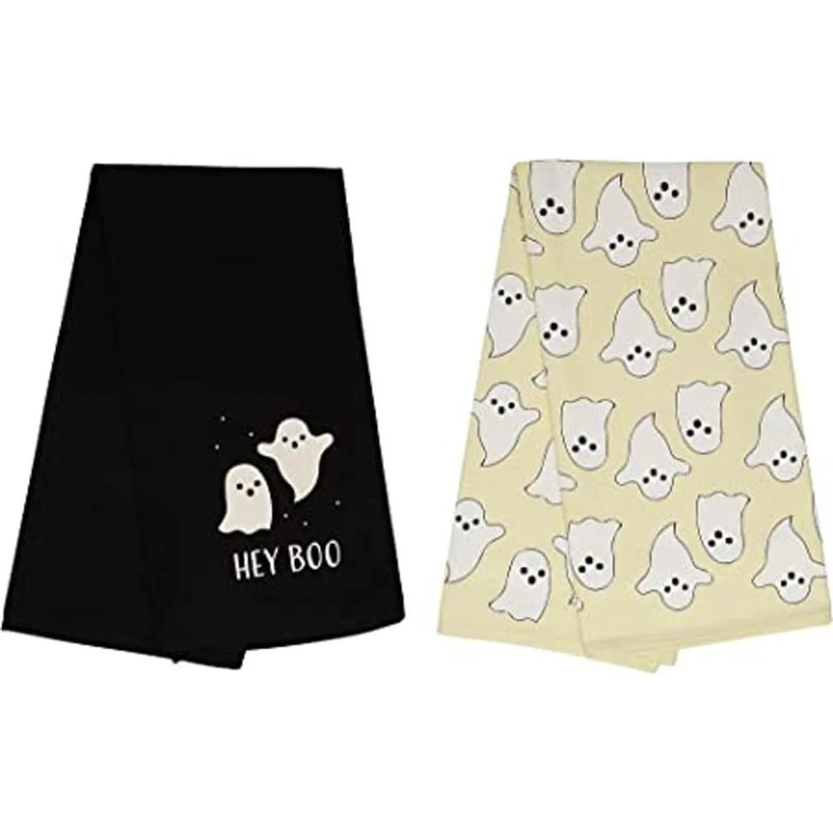 El juego de toallas de cocina temáticas de Halloween incluye una toalla blanca con un estampado fantasma completo y una toalla negra con impresión blanca hey boo debajo de un divertido y espeluznante gráfico fantasma