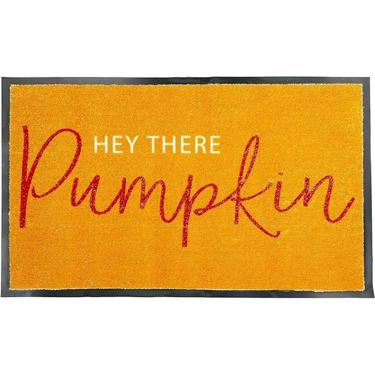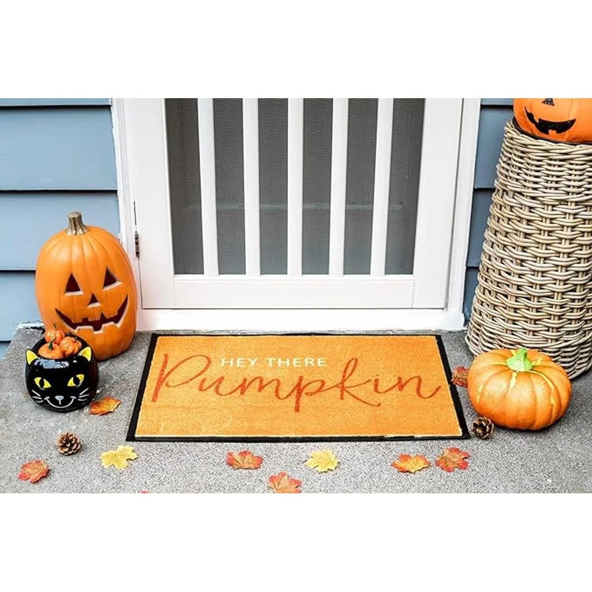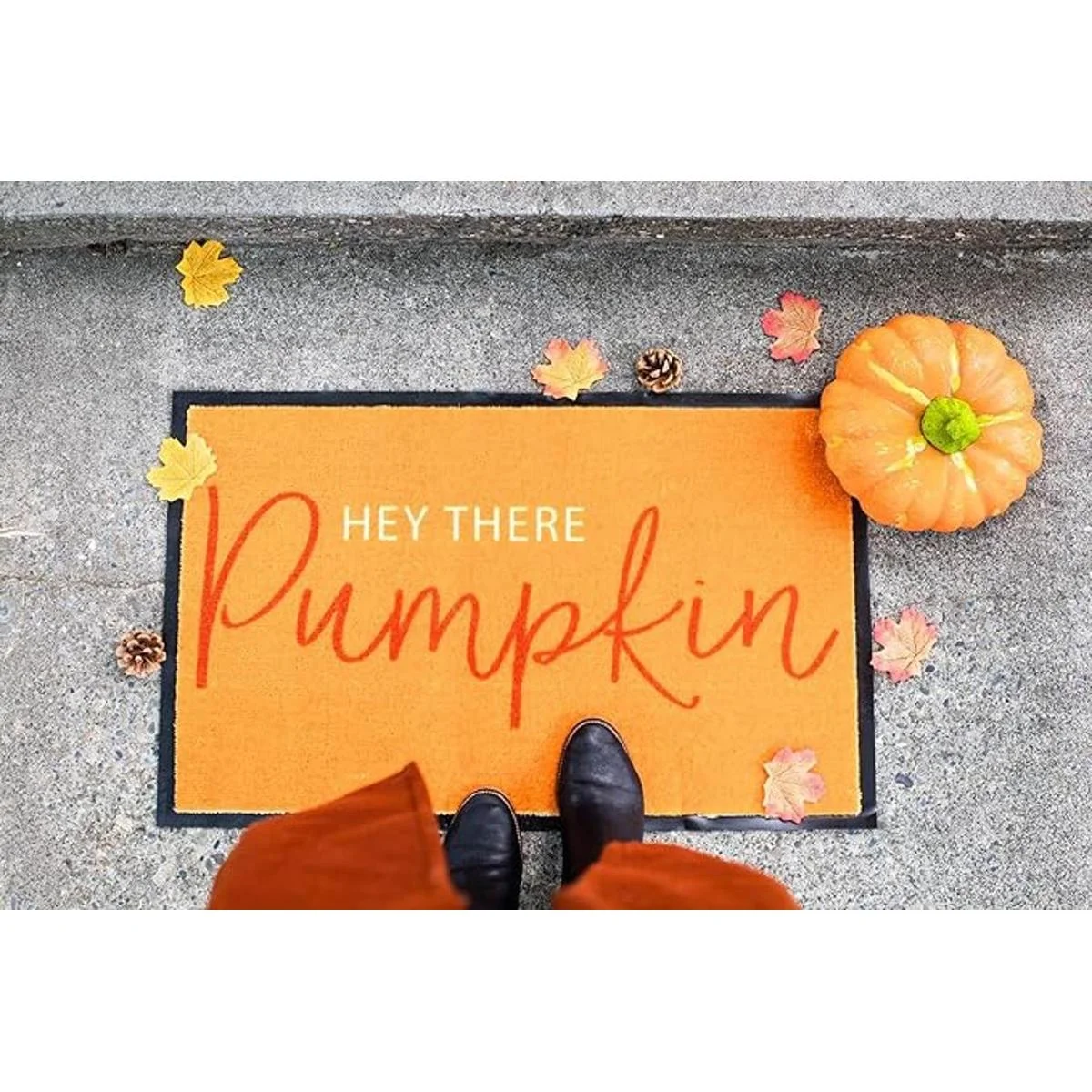Incluye un felpudo naranja para exteriores para el hogar con tablero negro e impresión hey there pumpkin en el medio, la parte posterior de la alfombrilla es de goma antideslizante para garantizar que la alfombrilla se mantenga en su lugar de forma segura