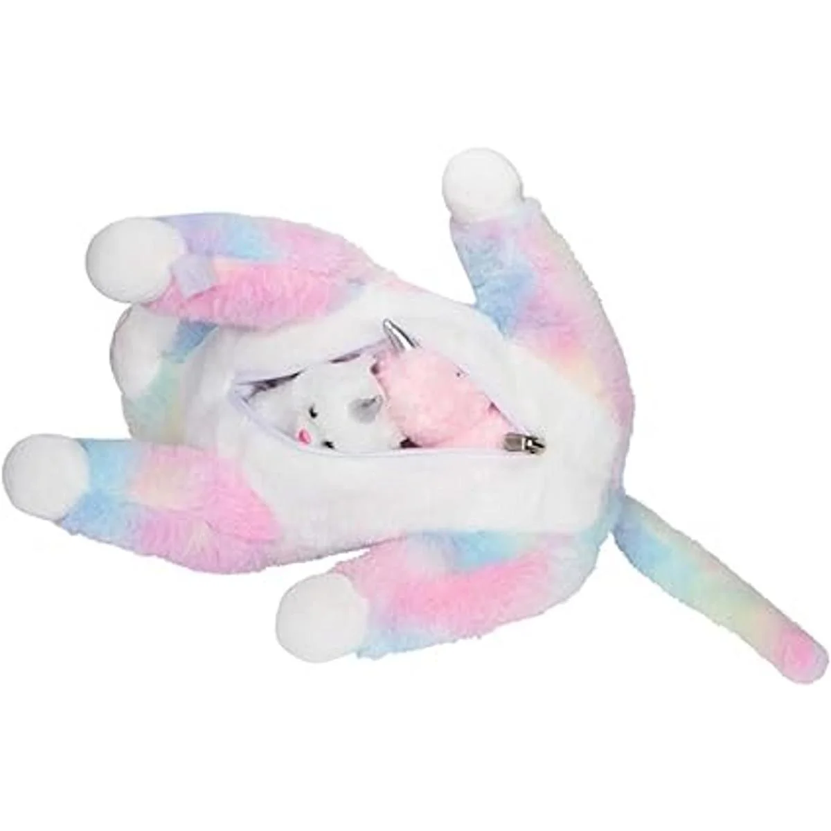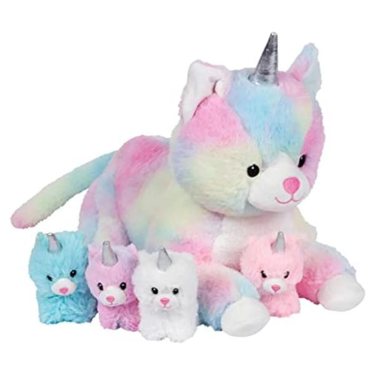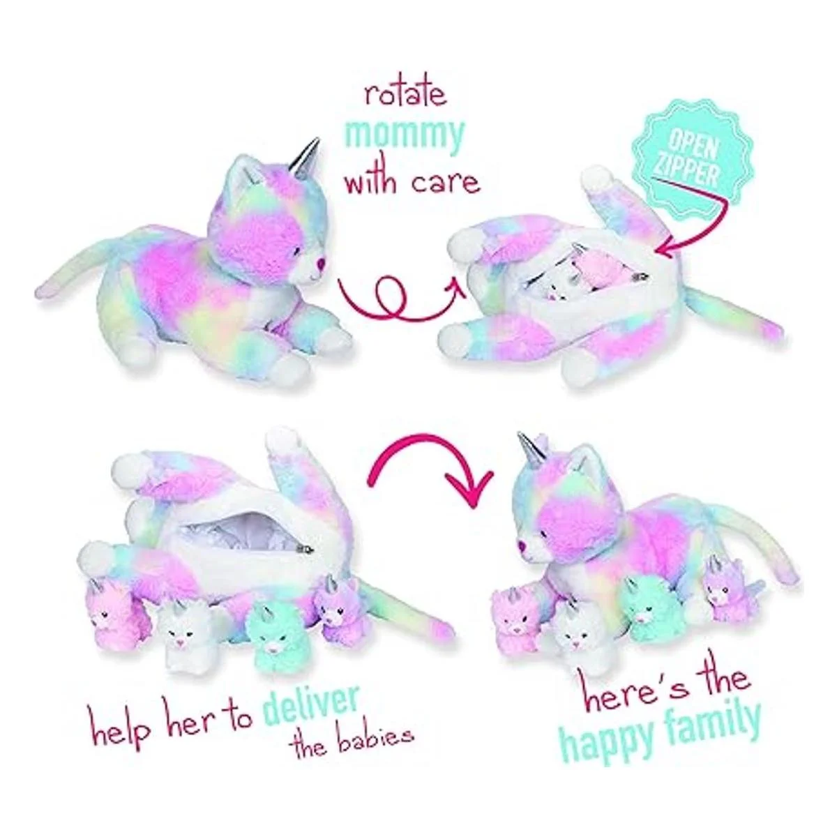 Cinco juguetes en uno: La mamá gata de peluche viene con una sorpresa en su vientre, 4 gatitos bebé que se pueden quitar a través de la apertura con cremallera en la barriga de la mamá.