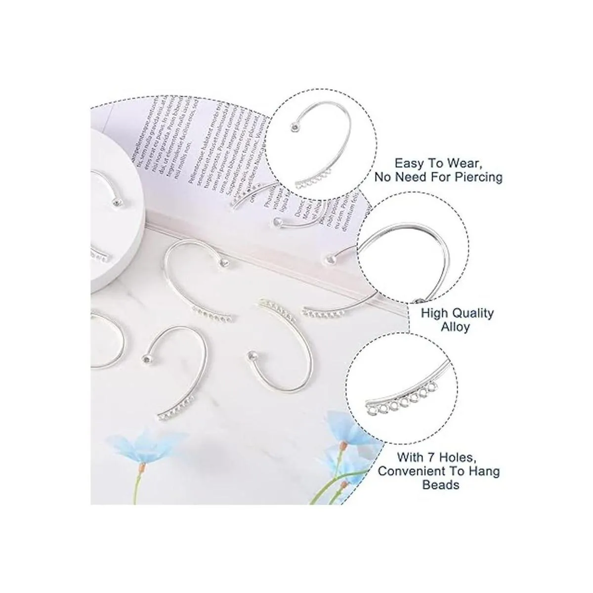 Feature: Designed to wrap around the ear and findings have 7 holes for hanging .