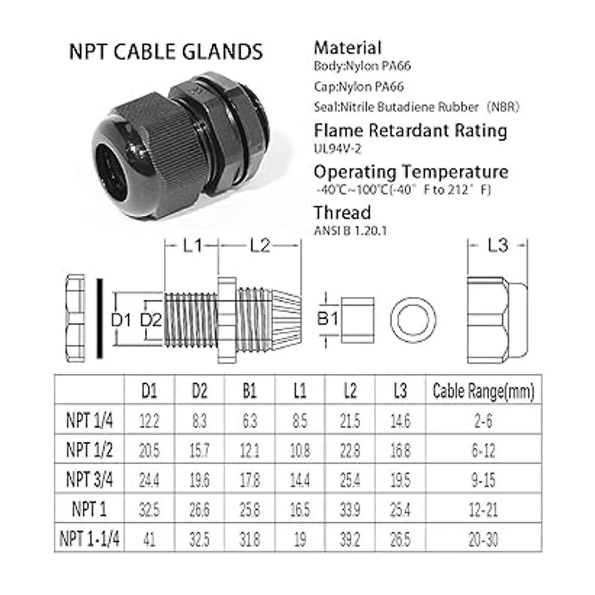 Calidad duradera: la carcasa está hecha de nailon PA66 aprobado por UL, las glándulas NPT son ignífugas, antiUV y antienvejecimiento.