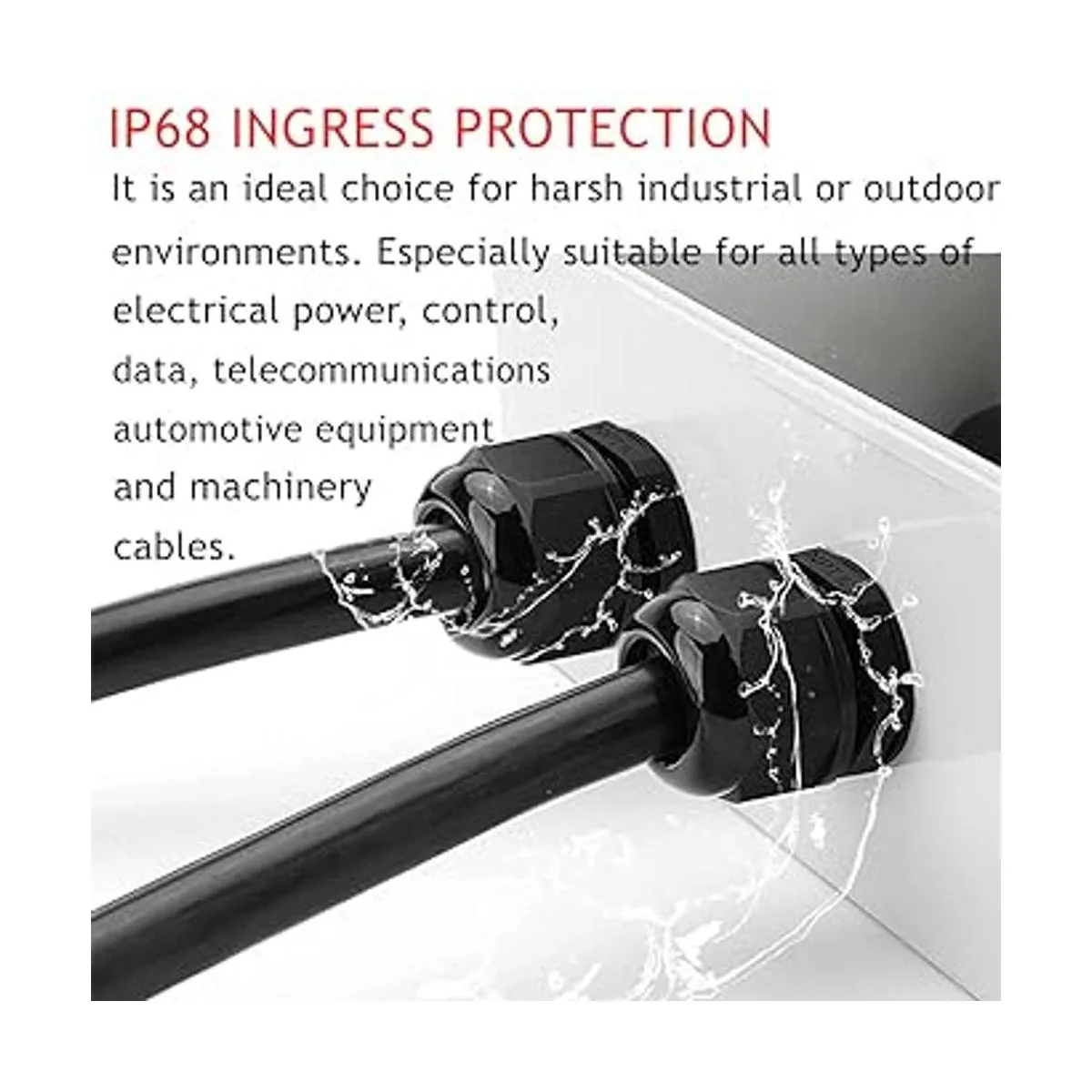 Resistente al agua IP68: es una opción ideal para entornos industriales o exteriores agresivos, especialmente adecuado para todo tipo de energía eléctrica, control, instrumentación, datos, equipos automotrices de telecomunicaciones y cables de maquinaria. La carcasa está hecha de nailon PA66 aprobado por UL, las glándulas NPT son ignífugas, antiUV y antienvejecimiento.