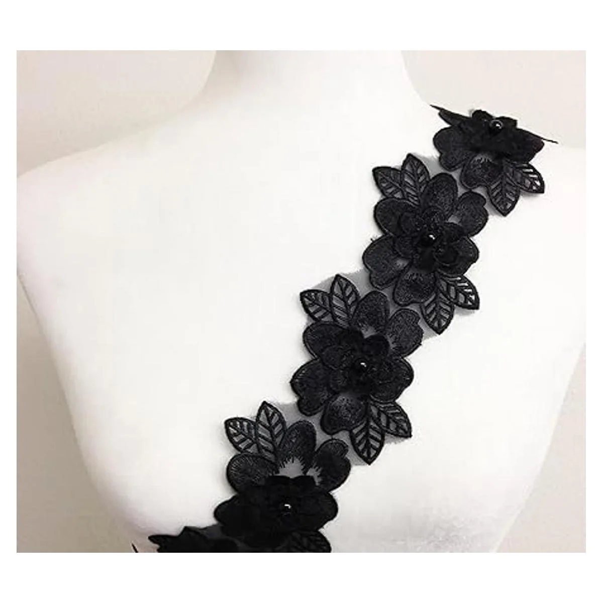PEPPERLONELY 10 cintas de encaje bordadas de flores de gasa con perlas negras, 2.6 x 3.1 in
