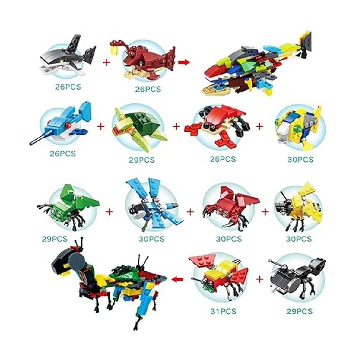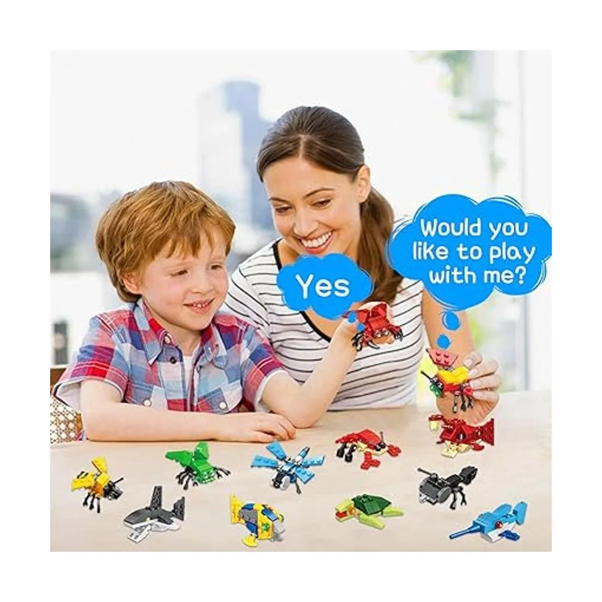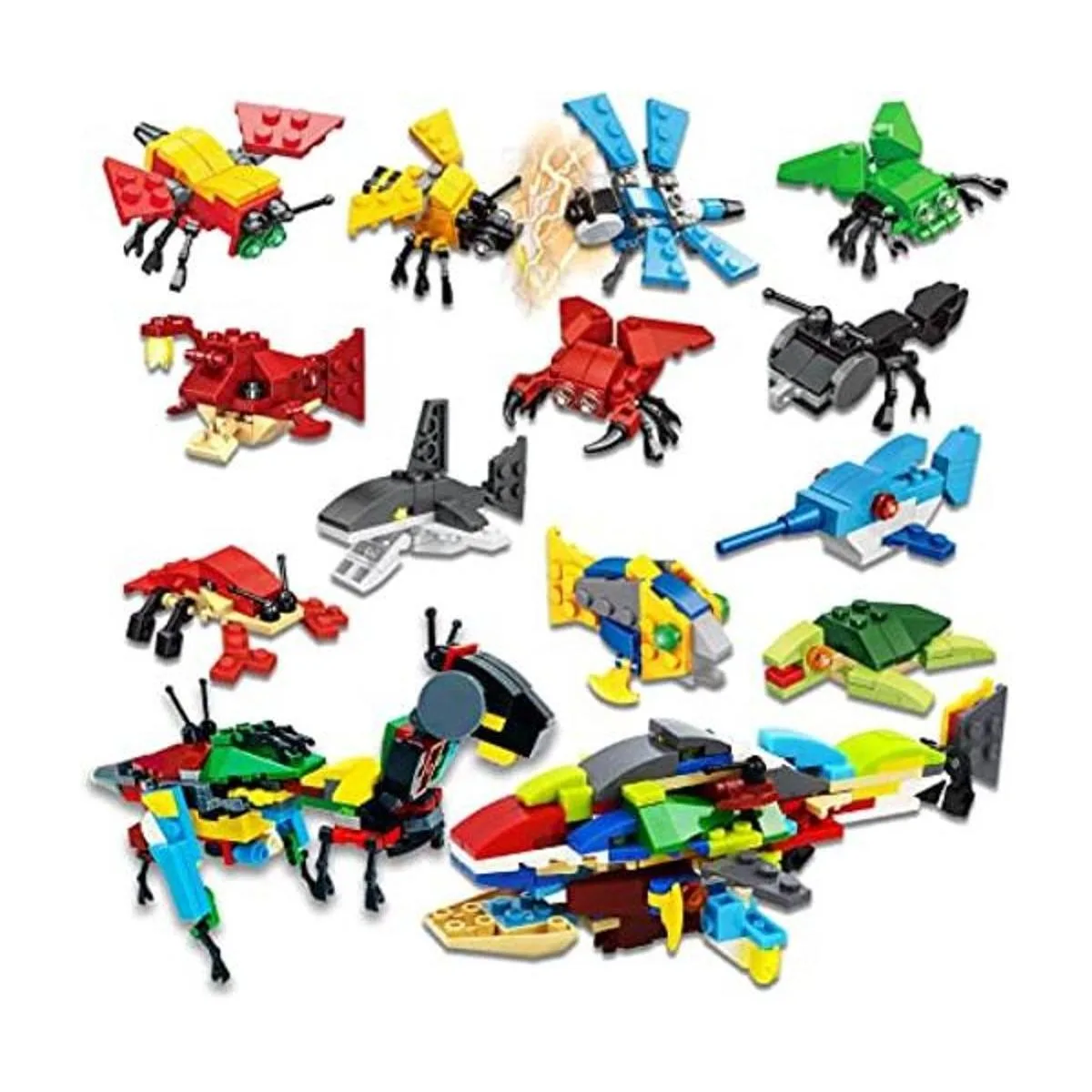 Diseño creativo y divertido juego 6 en 1: hay 12 tipos diferentes de juguetes de bloques de construcción. Los insectos incluyen: hormigas, libélulas, abejas, escarabajos, cuernos largos y mariposas. Los animales marinos incluyen: tiburones, pez espada, tortugas, langostas, peces payasos, peces de ganso. Divertido juego 6 en 1, 6 insectos diferentes y animales marinos pueden integrarse en 1 hormiga grande y 1 ballena, deja que el niño tenga más desafíos.
