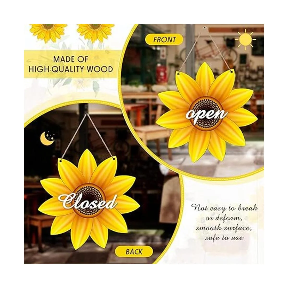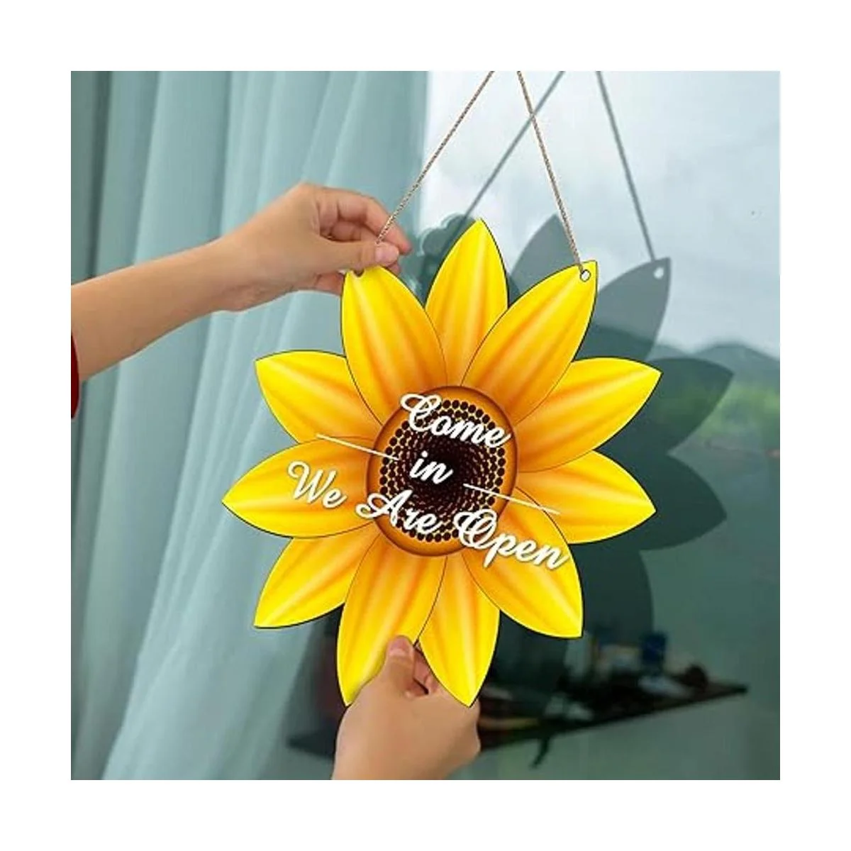 Contenido del paquete: hay 2 ganchos de madera de girasol con 1 cuerda natural, y puedes utilizar la cuerda para colgar el colgador de puerta de madera de girasol en tu puerta como decoración o letrero de bienvenida