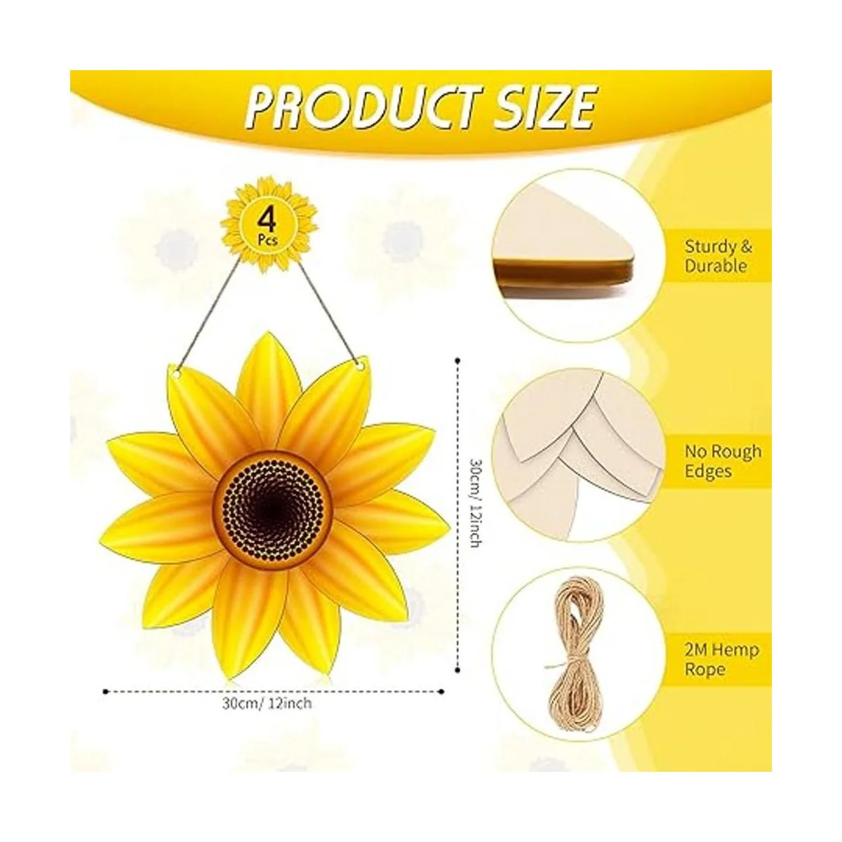 Información sobre el tamaño: cada recorte de madera de girasol sin terminar está diseñado en forma irregular de girasol, aprox. 11.8 in de diámetro, 0.118 in de grosor; y la cuerda natural es de aproximadamente 6.6 ft de largo, y se puede cortar en diferentes longitudes de acuerdo a tus necesidades