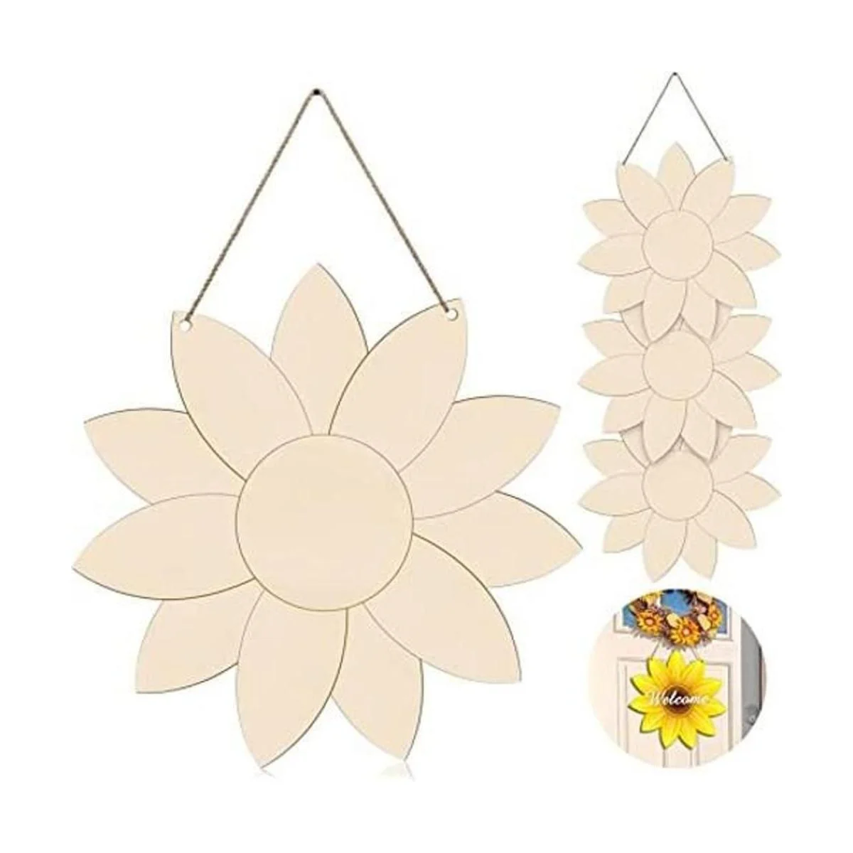 Percha de puerta de madera de girasol sin terminar con recortes de girasol, madera de girasol, con cuerda natural de 2.2 yardas, para colgar en la pintura, letrero de bienvenida para primavera, verano, decoración del hogar 4