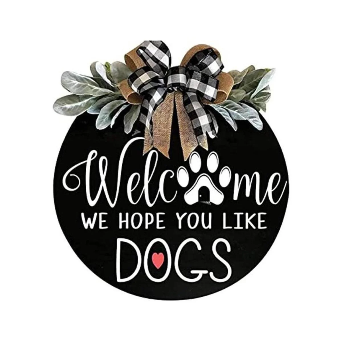 Percha para puerta de corona de bienvenida de 12 pulgadas, con texto en inglés Welcome We Hope You Like Dogs, colgante de corona negra, decoración de casa de perro, colgante de madera, colgante de pared, decoración de porche de granja, lazo a cuadros
