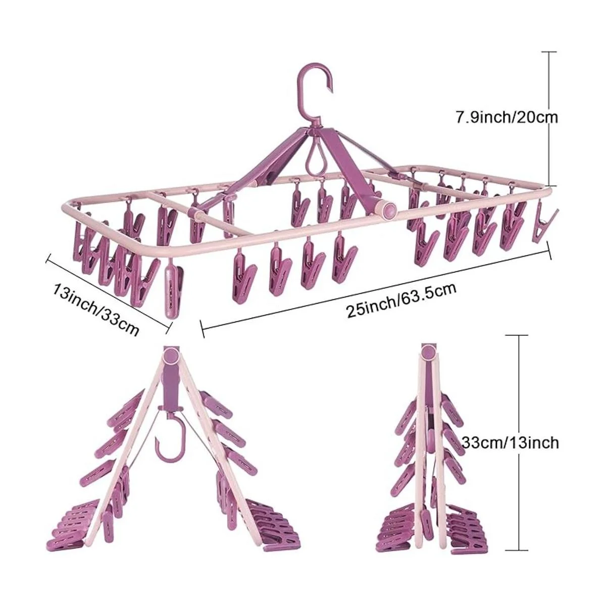 Diseño perfecto Los clips desmontables se pueden utilizar solos. Diseñado con un práctico cuello giratorio de 360 y un gancho giratorio suave, este colgador para calcetines se puede girar a cualquier ángulo que desees y es fácil secar la ropa desde todas las direcciones. Los clips para colgar están perfectamente espaciados para maximizar eficazmente el flujo de aire.