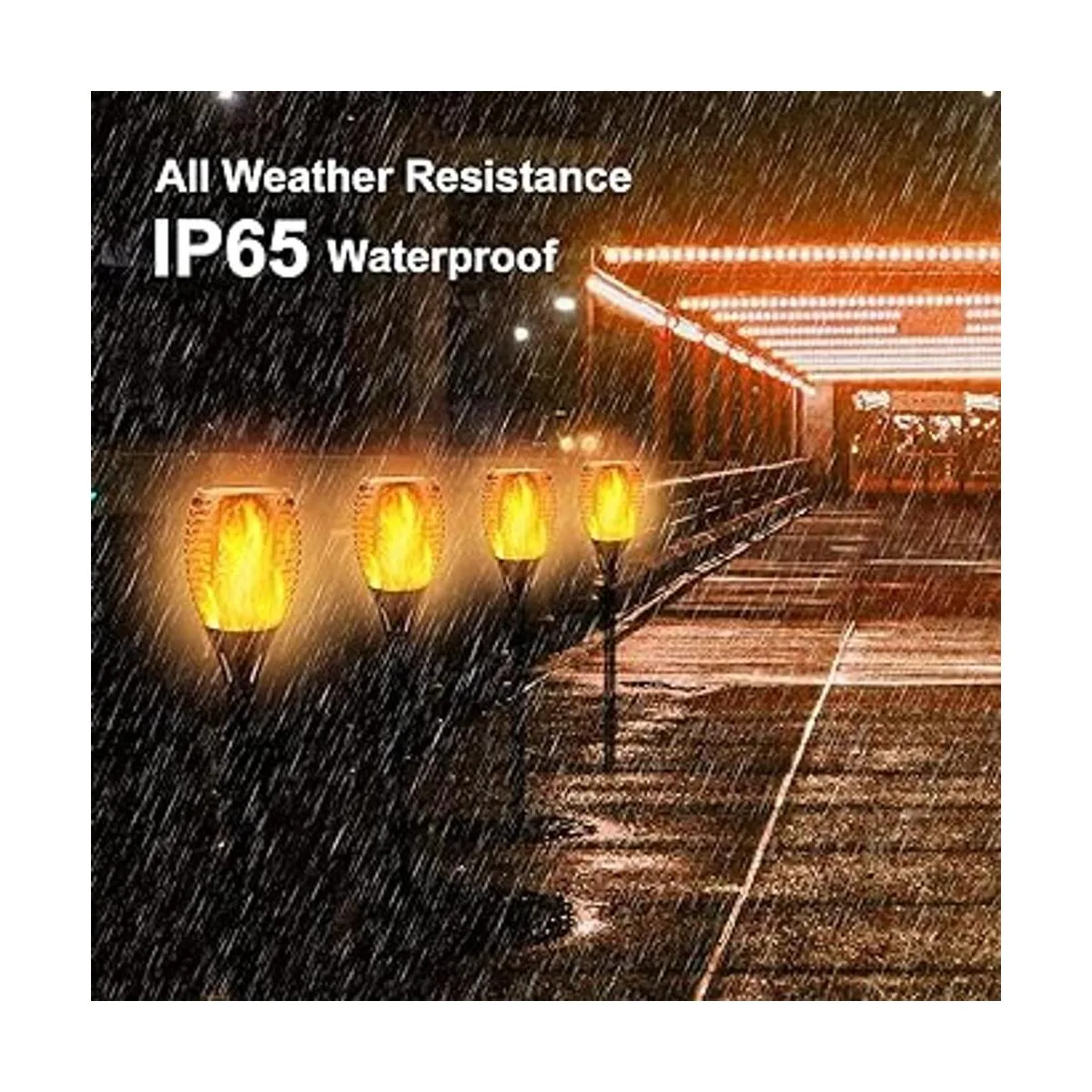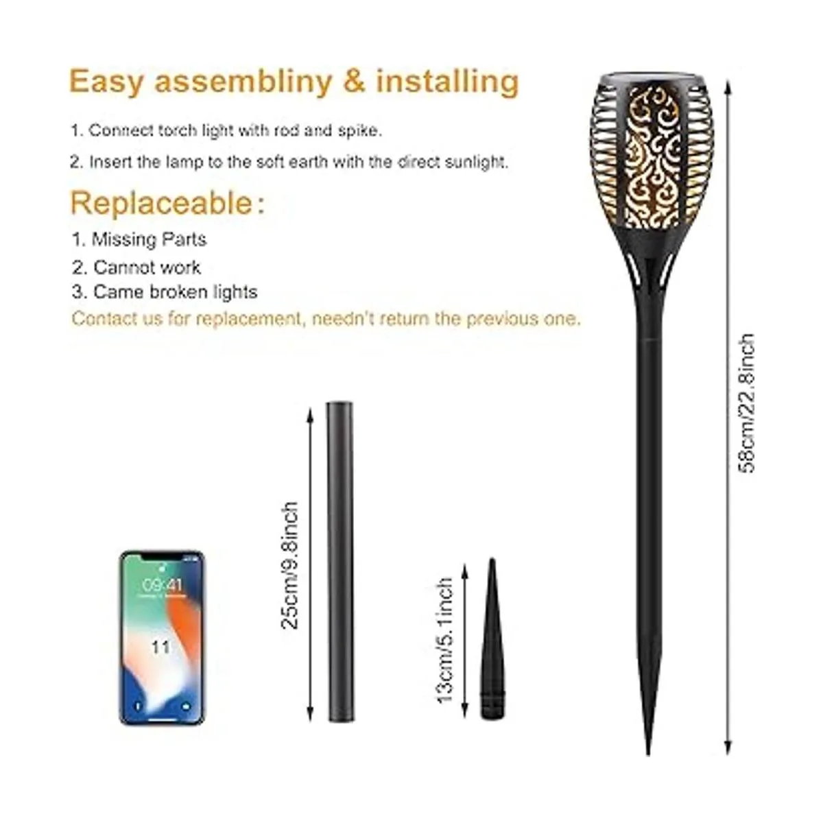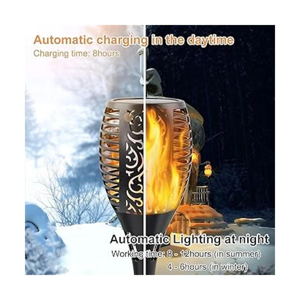 Funciona con energía solar y funciona toda la noche: las luces solares de llama con batería recargable integrada de 600 mAh, puede iluminar toda la noche después de cargarse completamente por energía solar. Con un sensor de luz, el panel solar se cargará automáticamente durante el día, y la luz se encenderá automáticamente al anochecer y se apagará al amanecer.