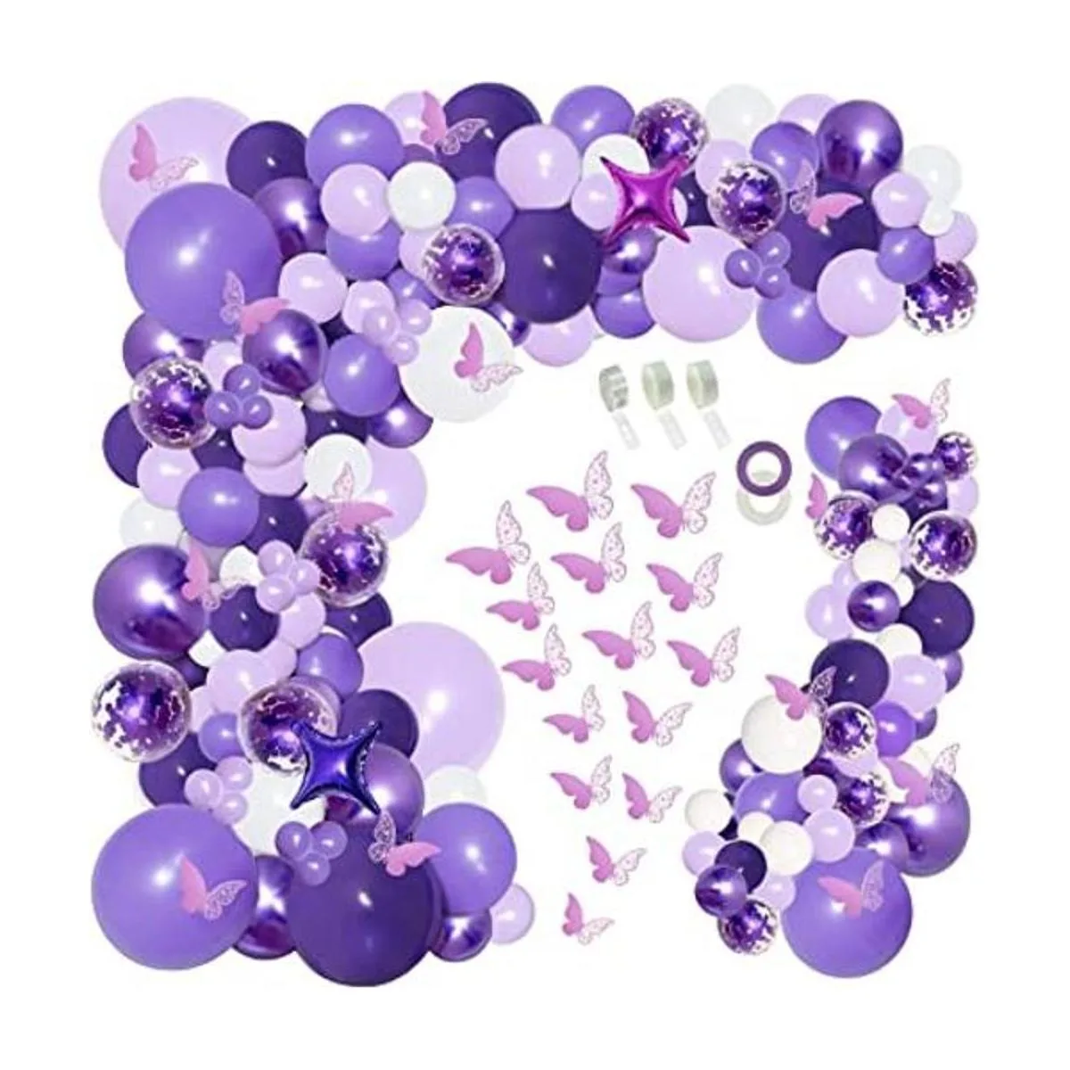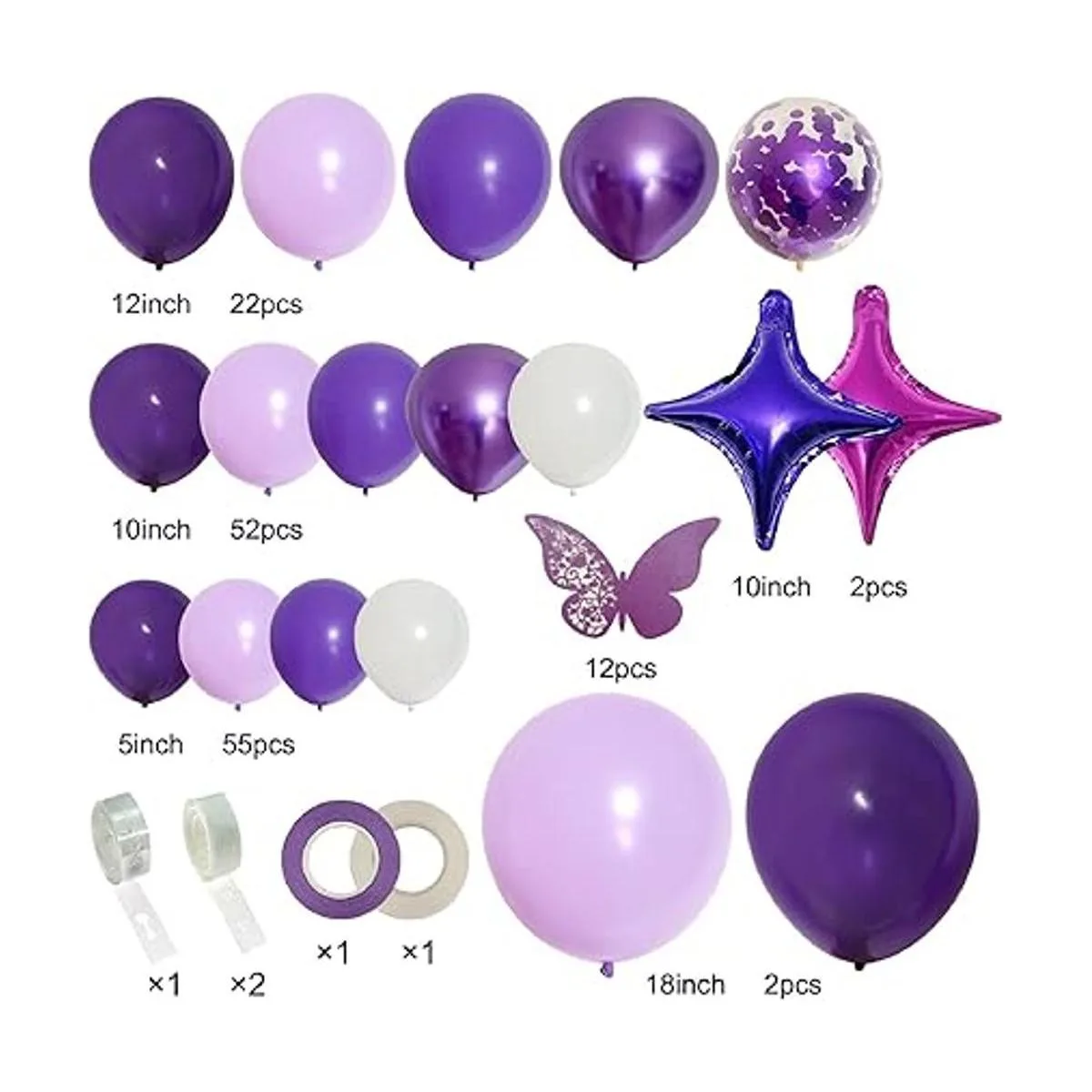 Kit de guirnalda de globos morados: total 150 piezas. 133 globos de papel de aluminio de látex: globos morados de 18 pulgadas; globos de confeti púrpura metálico de 12 pulgadas; globos de confeti púrpura metálico de 5 pulgadas, morado metálico de 10 pulgadas, morado oscuro, morado macarrón, morado claro, globos blancos. Pegatinas de mariposa, 12 unidades, tira de globos, cinta y pegamento.