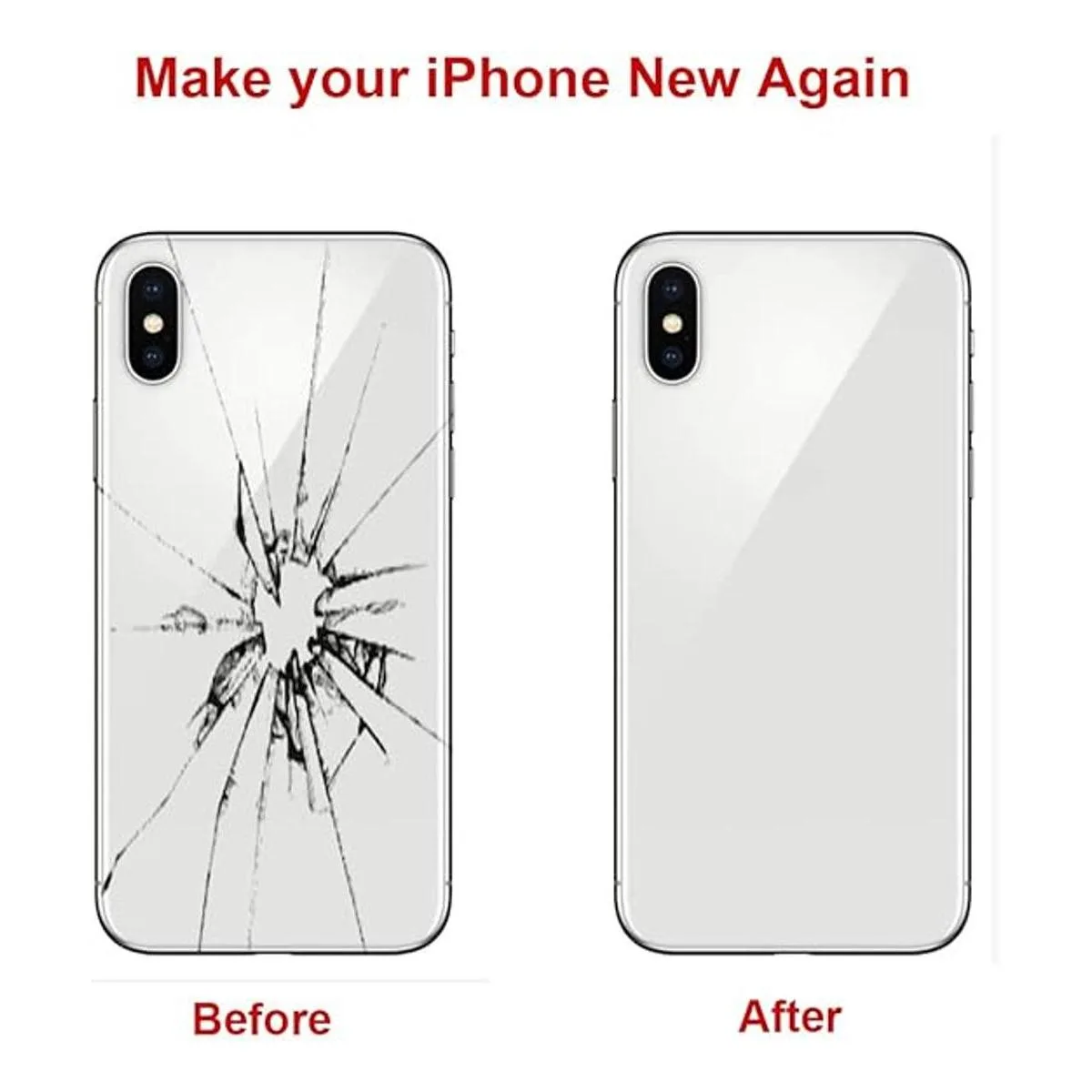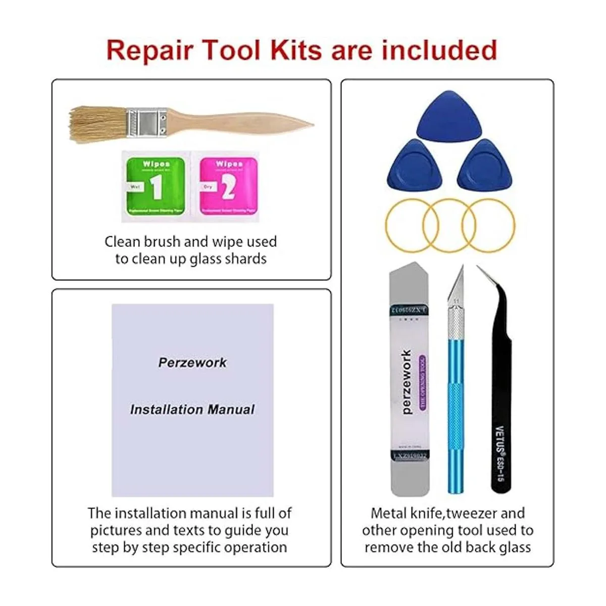Viene con kit de herramientas completo: viene con un juego completo de herramientas de reparación profesional. Es mucho más fácil quitar el cristal trasero roto. Ten en cuenta que necesitas preparar un secador de pelo, porque el adhesivo original es muy fuerte.
