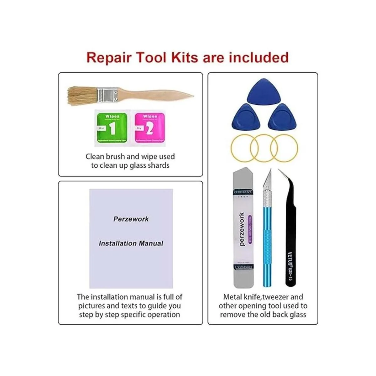Viene con kit de herramientas completo: viene con un juego completo de herramientas de reparación profesional. Es mucho más fácil quitar el cristal trasero roto. Ten en cuenta que necesitas preparar un secador de pelo, porque el adhesivo original es muy fuerte.