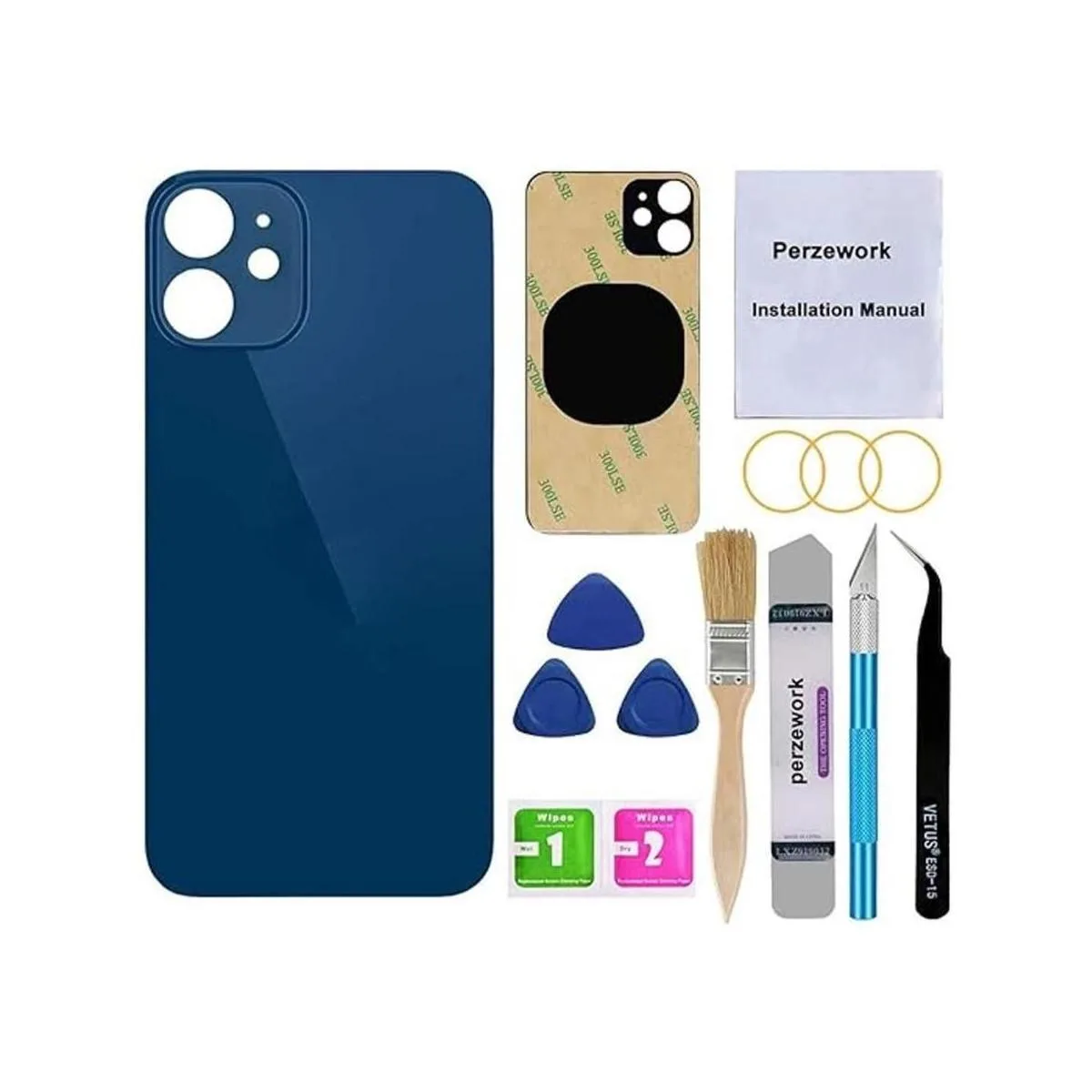 Perzework Repuesto de vidrio trasero OEM para iPhone 12 de 6.1 pulgadas con kit de herramientas de reparación y adhesivo preinstalado azul