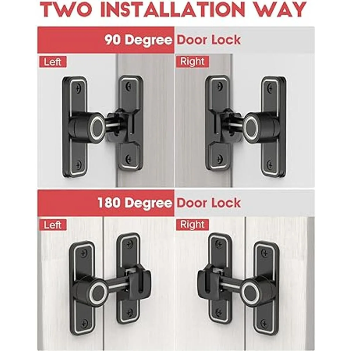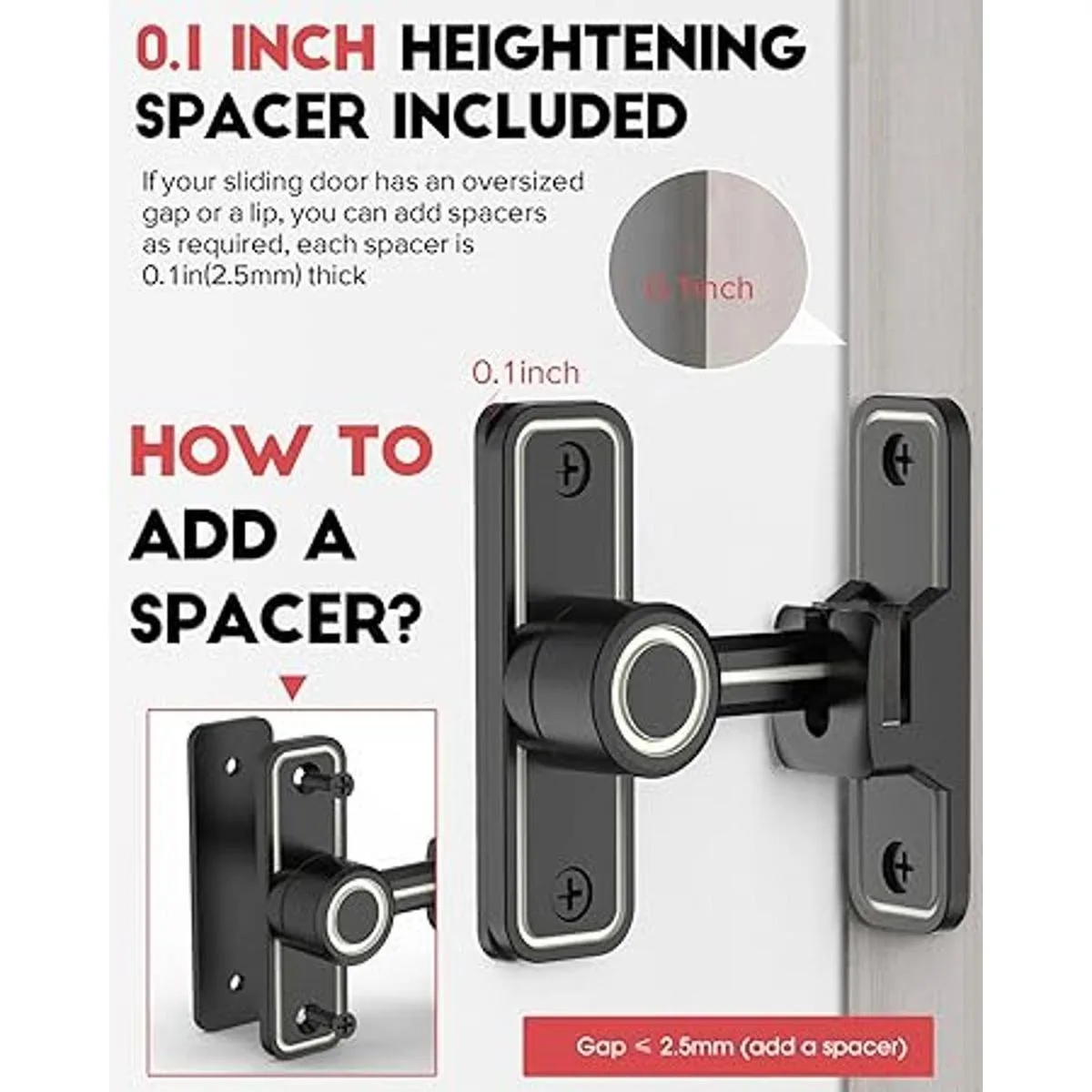 Puerta corredera multiusos de 90/180 grados: las cerraduras de leva de perno se pueden montar en ángulos rectos de 90, también se pueden montar en ángulos de 180 grados para ahorrar aún más espacio. Ideal para puertas de madera, puertas de metal, puertas de vinilo o aplicaciones de postes, uso en dormitorios familiares, patio, baños, cubierta, cobertizos, puerta de bebé, cabañas, ventanas, armarios, garajes, cocinas, oficinas, valla de privacidad o puerta de gallinero, puertas de granero.