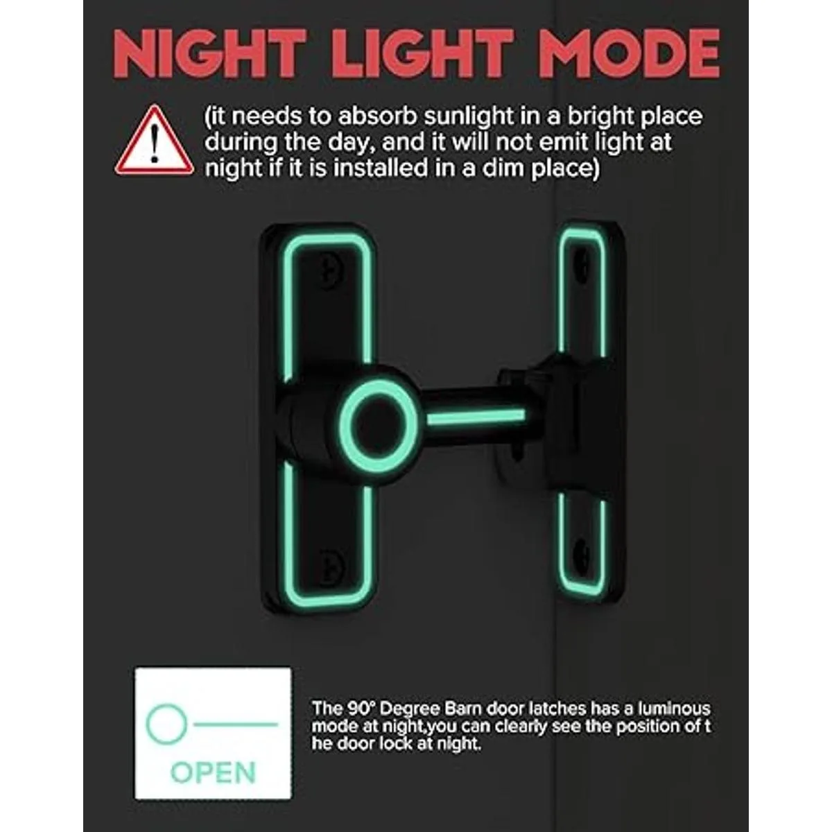 Diseño de modo de luz nocturna: la cerradura de puerta de granero de 90 tiene un modo luminoso por la noche, puedes ver claramente la posición de la cerradura de la puerta por la noche necesita absorber la luz solar en un lugar brillante durante el día, y no emitirá luz por la noche si se instala en un lugar tenue.