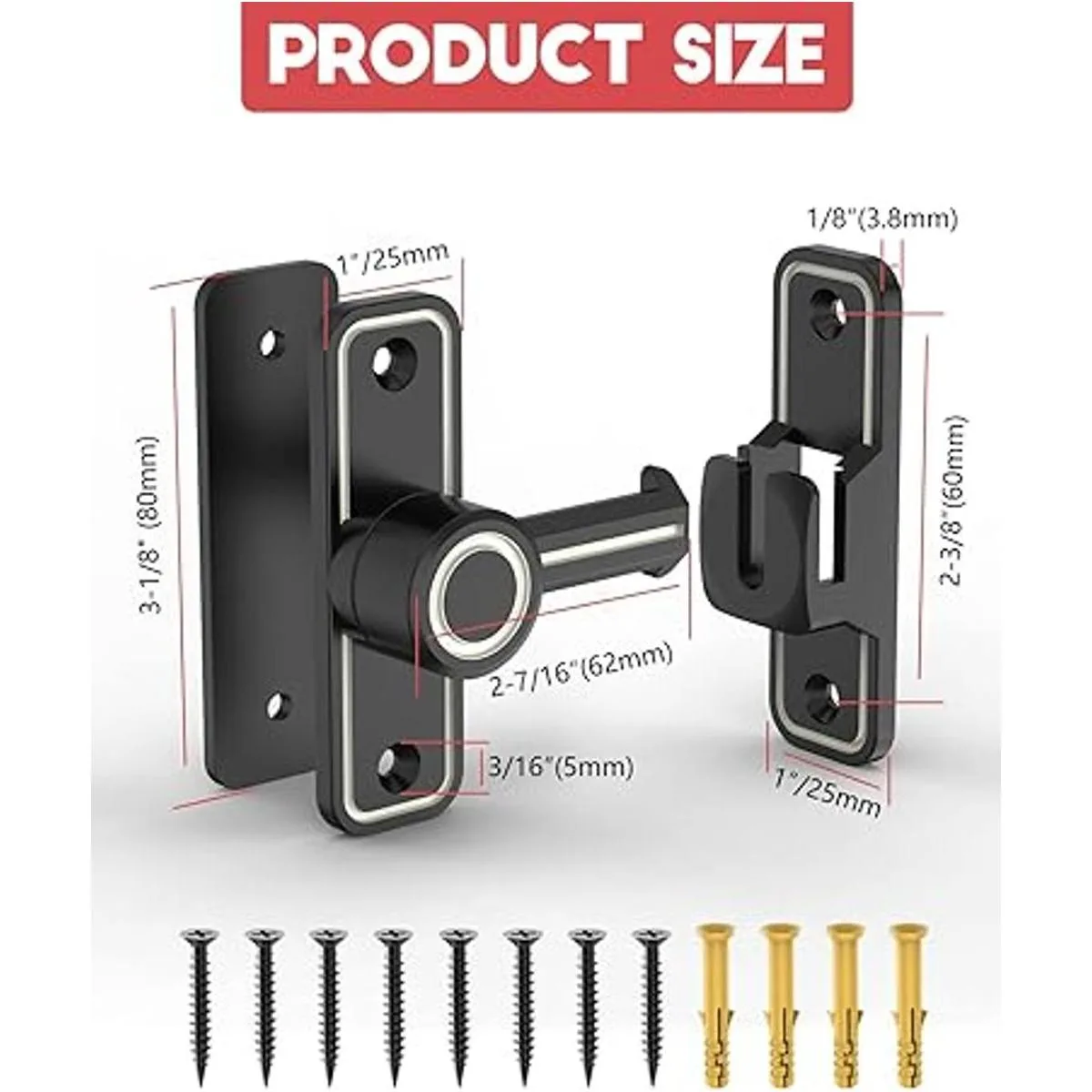 Contenido del paquete: 1 cerradura de puerta de granero, 1 placa trasera de 0.098 in, 8 tornillos, 8 tubos de expansión