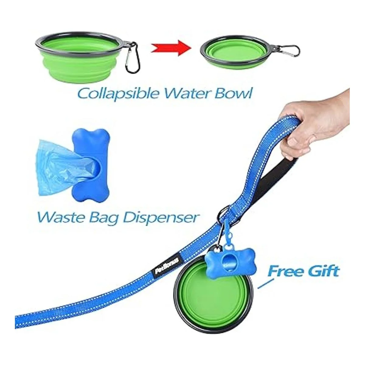 PetBonus Correa doble para perro, sin enredos, correa de entrenamiento reflectante para caminar, 4 cómodas asas acolchadas para 2 perros con cuenco plegable y dispensador de bolsas de basura