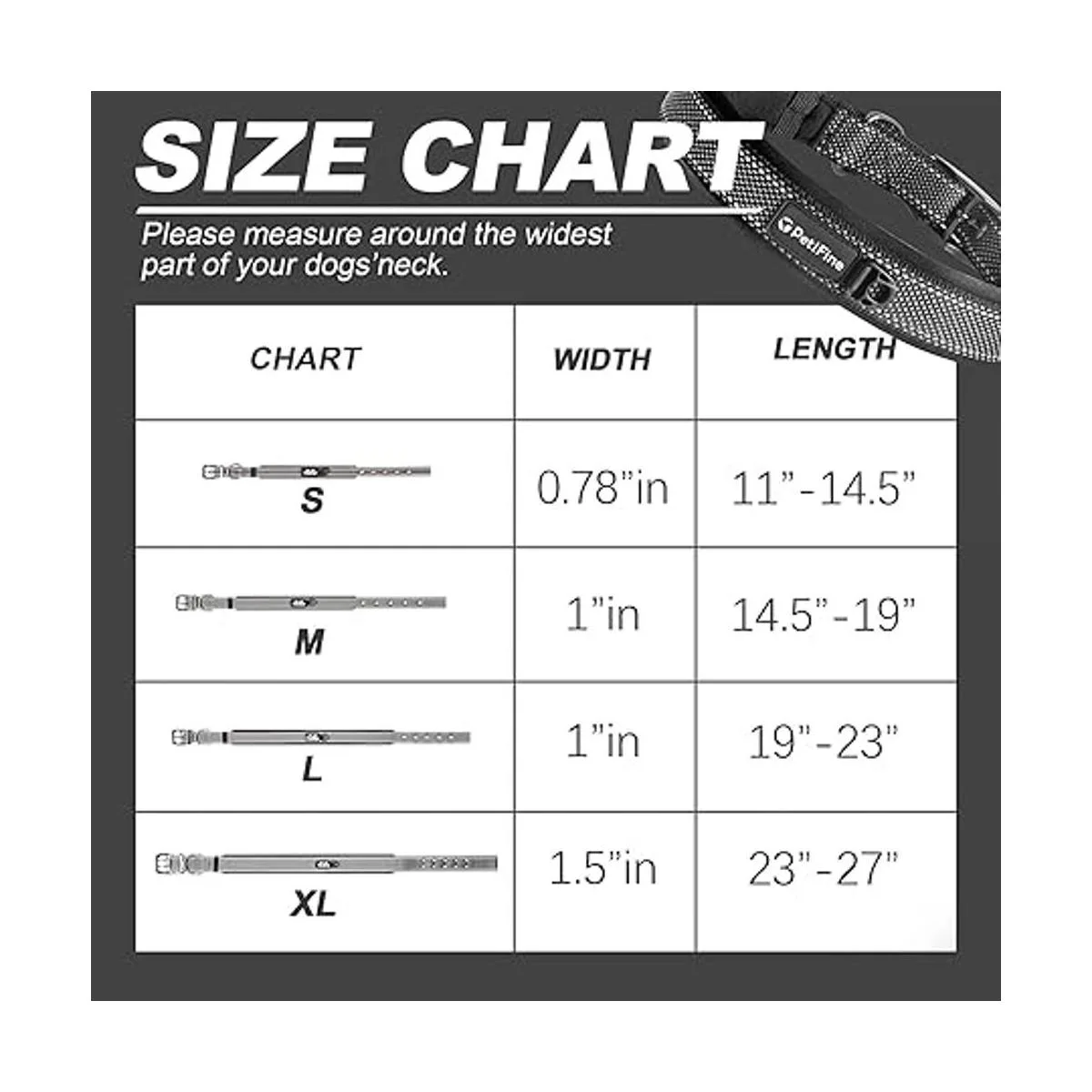 Tamaños convenientes para cada raza: no solo un collar de raza grande, este collar fuerte para perro está disponible en 4 tamaños para adaptarse a todos los tamaños de raza de perro. Collar de perro pequeño: 1114.5 pulgadas. Collar de perro mediano: 14.519 pulgadas. Collar de perro grande: 1923 pulgadas. Collar de perro XL: 2428 pulgadas. Selecciona el tamaño correcto en función de la circunferencia del cuello de tu perro. Mide alrededor del cuello donde el cuello se colocaría cómodamente.