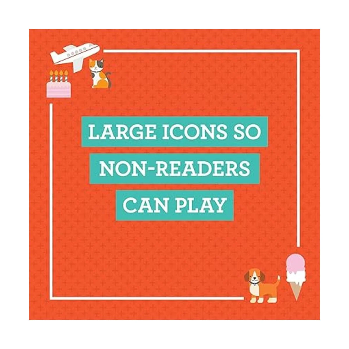 Gran actividad familiar: este es un gran juego para toda la familia. Llévalo por turnos para actuar la imagen para los otros jugadores, y quien adivine lo que hay en la tarjeta lo gana. Los iconos grandes hacen que sea fácil para los no lectores unirse a la diversión.