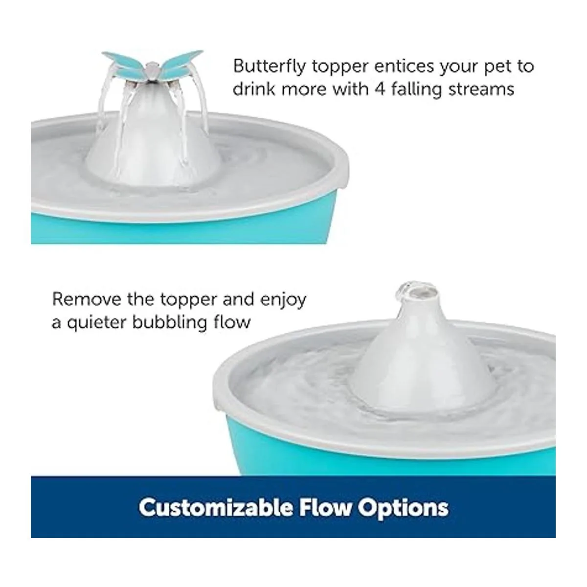 MULTIPLE STREAM OPTIONS: A decorative butterfly topper creates 4 water streams for your cat to drink from; remove the topper for a quiet, bubbling water flow