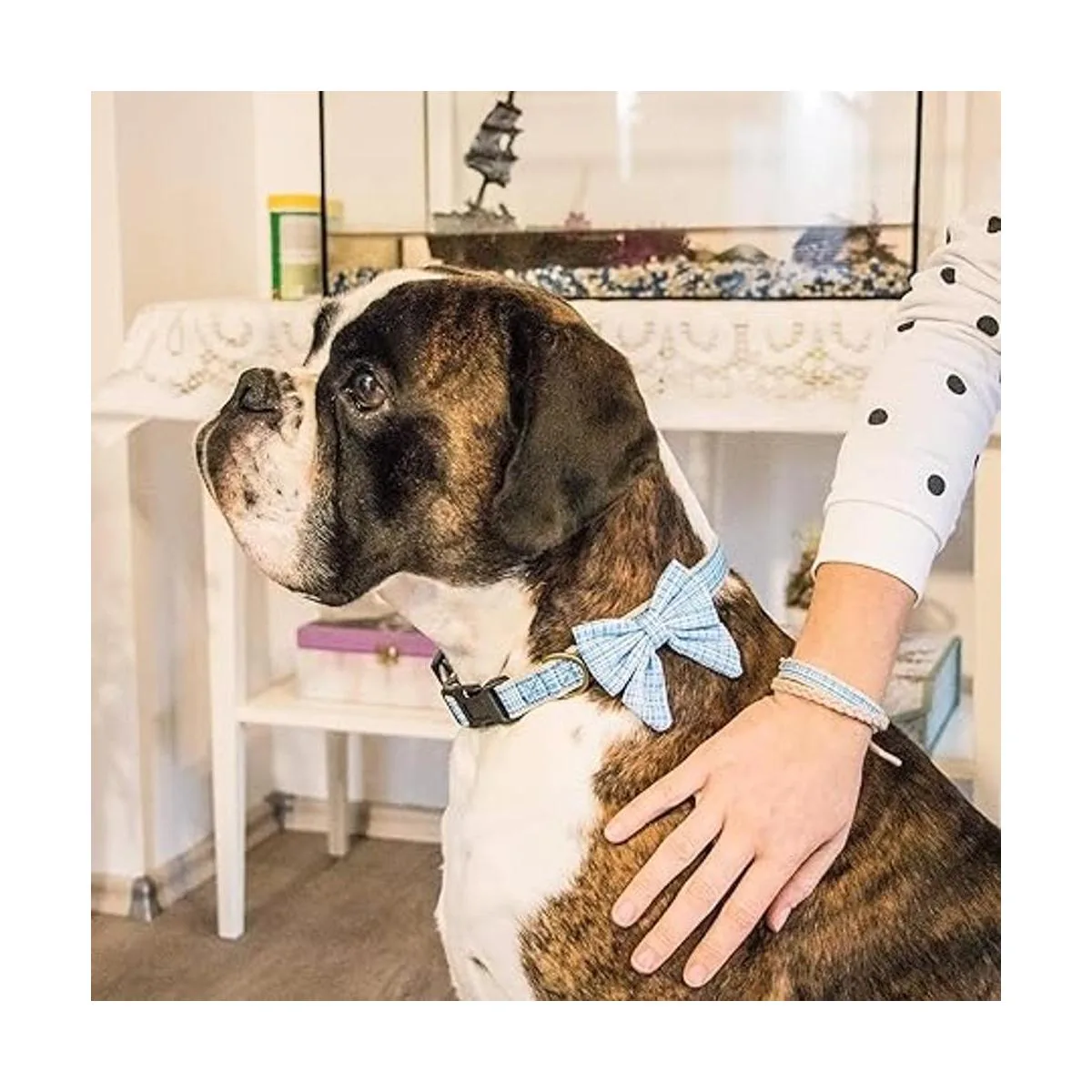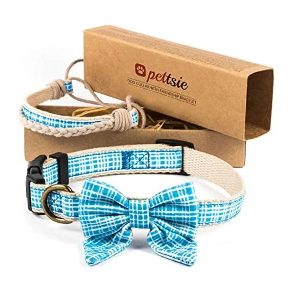 Pettsie Collar de perro con pajarita y pulsera de la amistad, tamaño ajustable pequeño y mediano, duradero, apto para mascotas con patrón de algodón elegante, anillo en D fuerte para accesorios, caja de regalo incluida M, azul