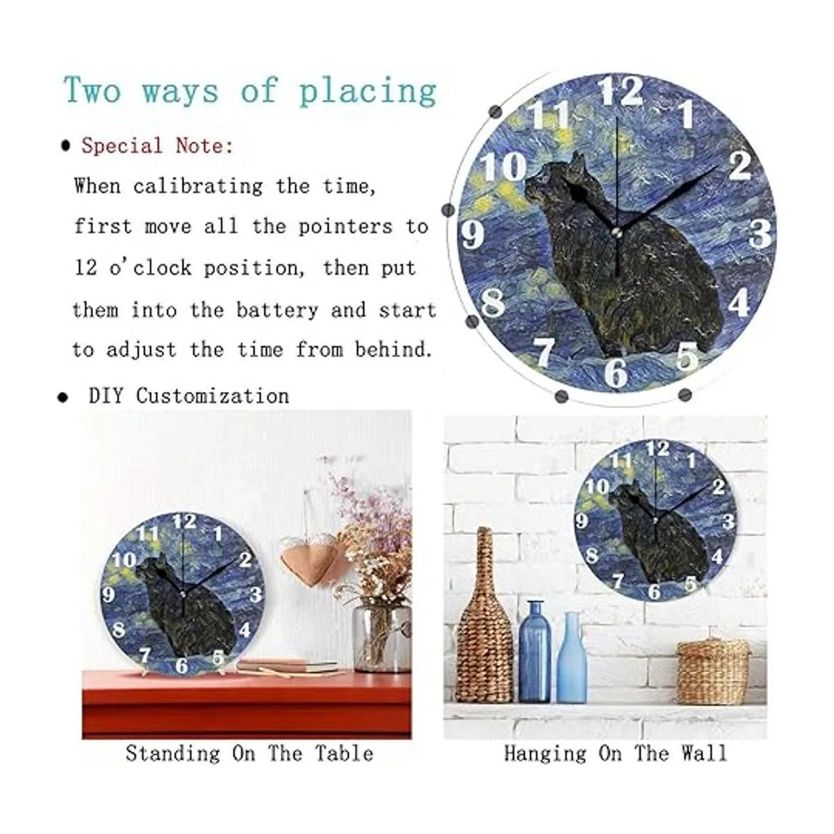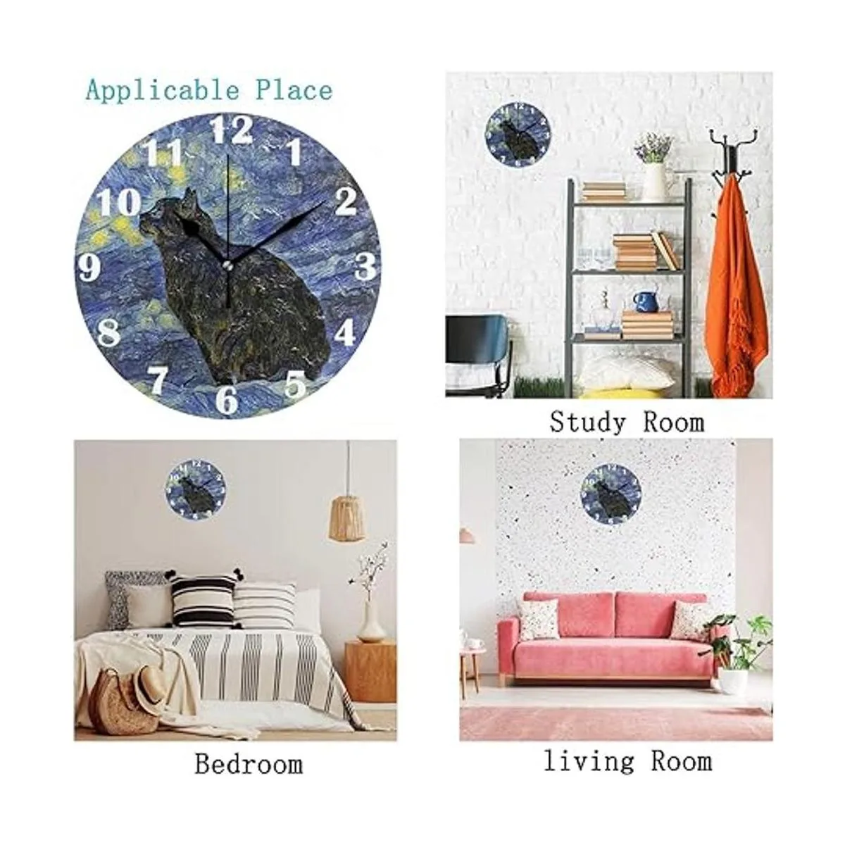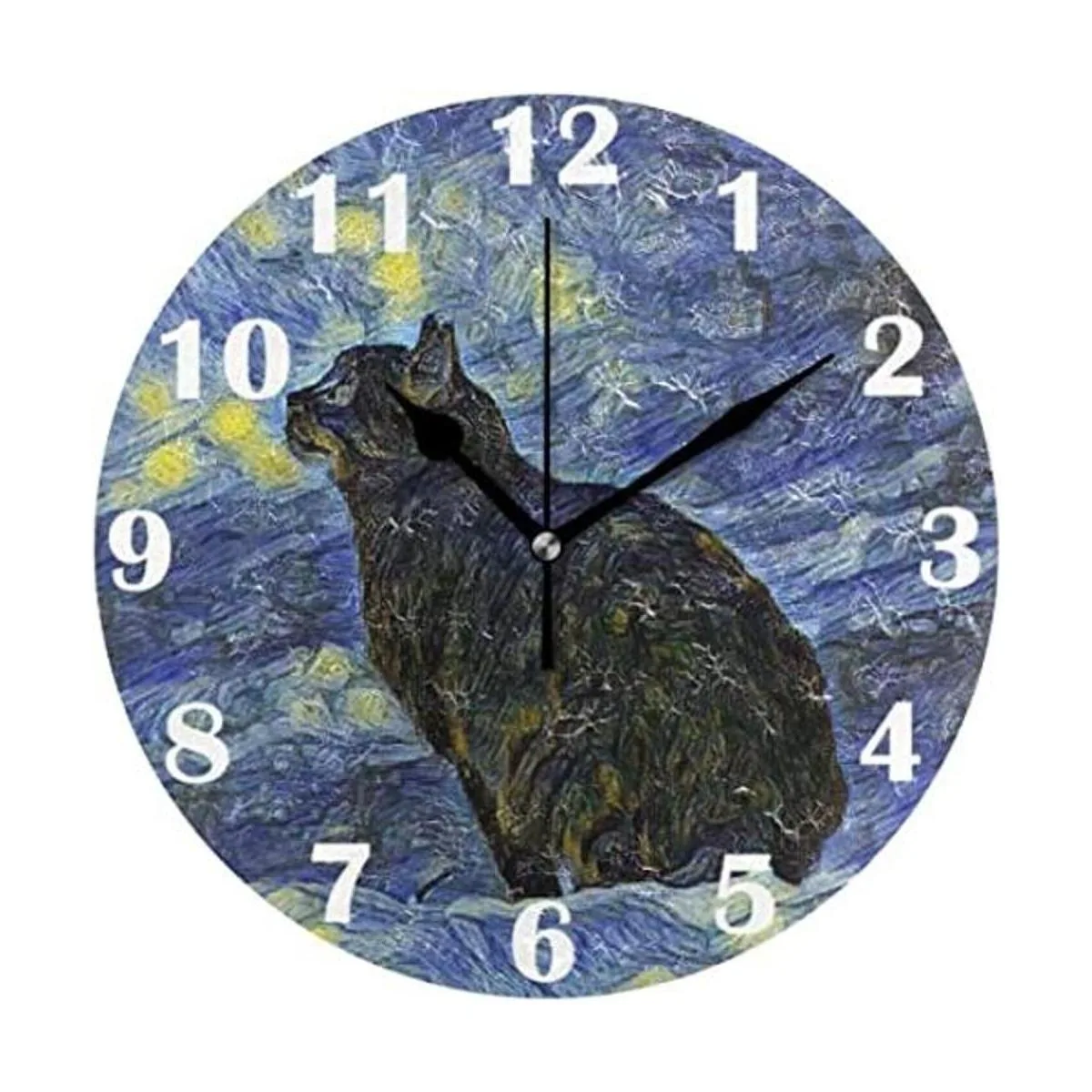 Pfrewn Lunar Star Cat Van Gogh Reloj de pared silencioso sin tiquear Animal Galaxy Relojes a pilas Reloj de escritorio vintage de 10 pulgadas de cuarzo analógico silencioso dormitorio sala de estar decoración del hogar