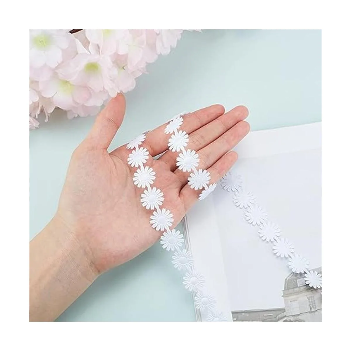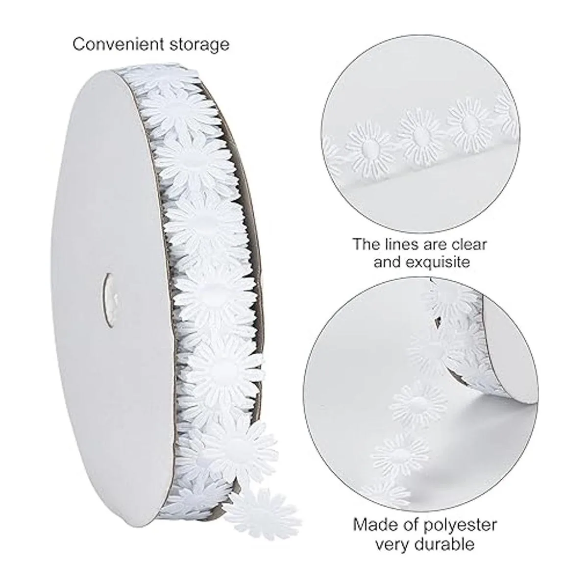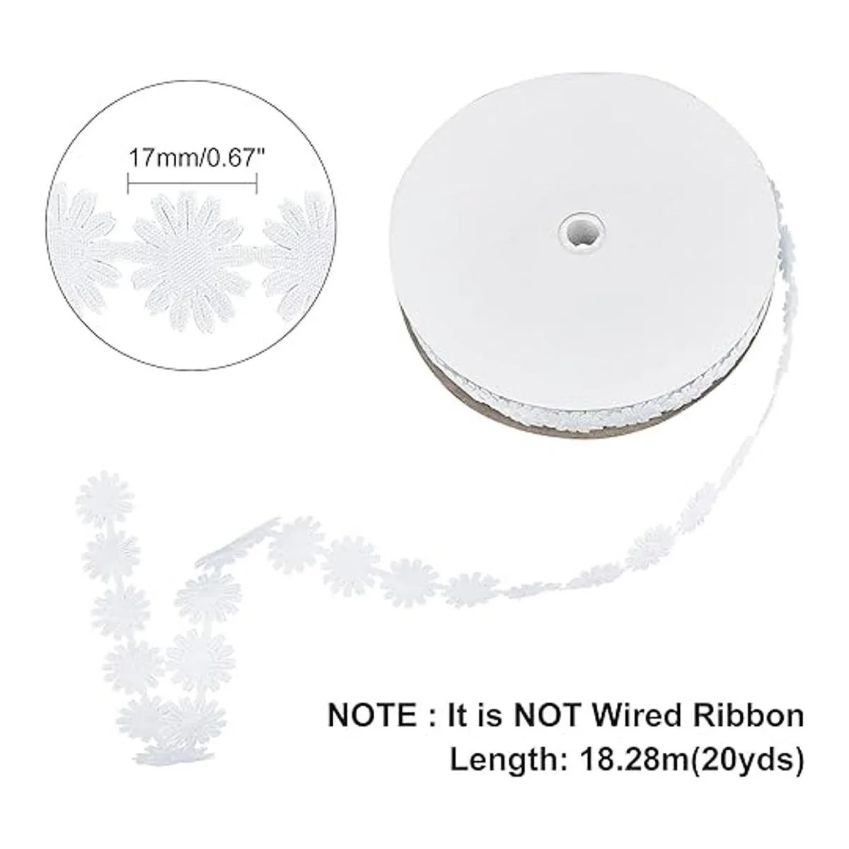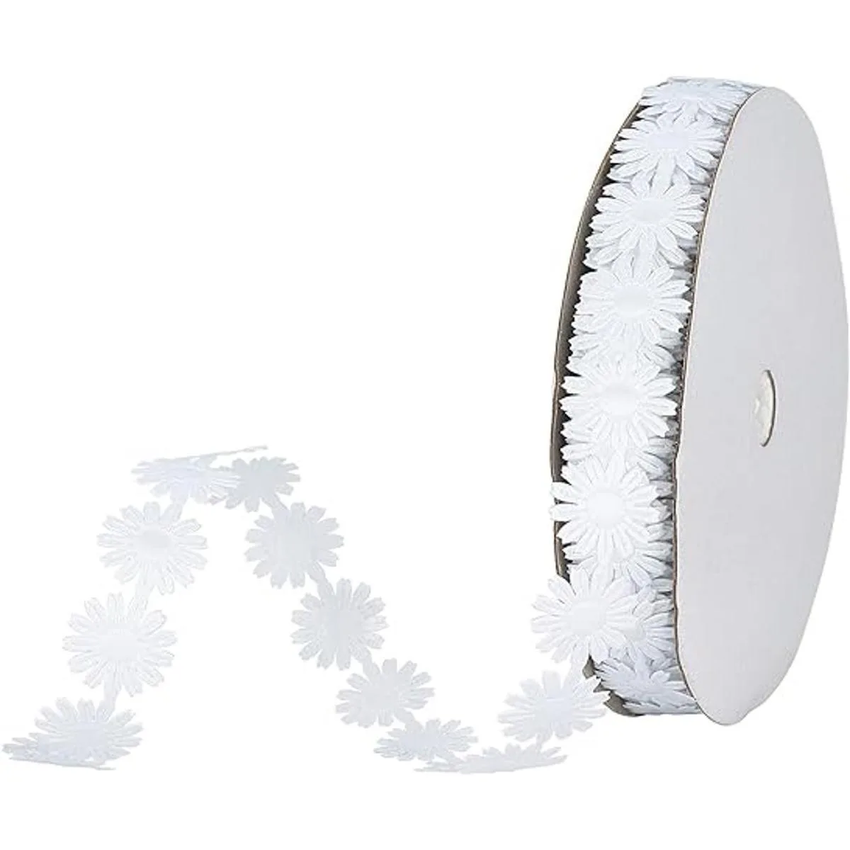 Lo que obtienes: el paquete incluye 1 rollo de cinta de encaje de margaritas, alrededor de 20 yardas de longitud, alrededor de 0.669 in de diámetro de la flor, lo suficientemente largo para tus proyectos de manualidades, puedes cortar una sola flor o la longitud que necesites.