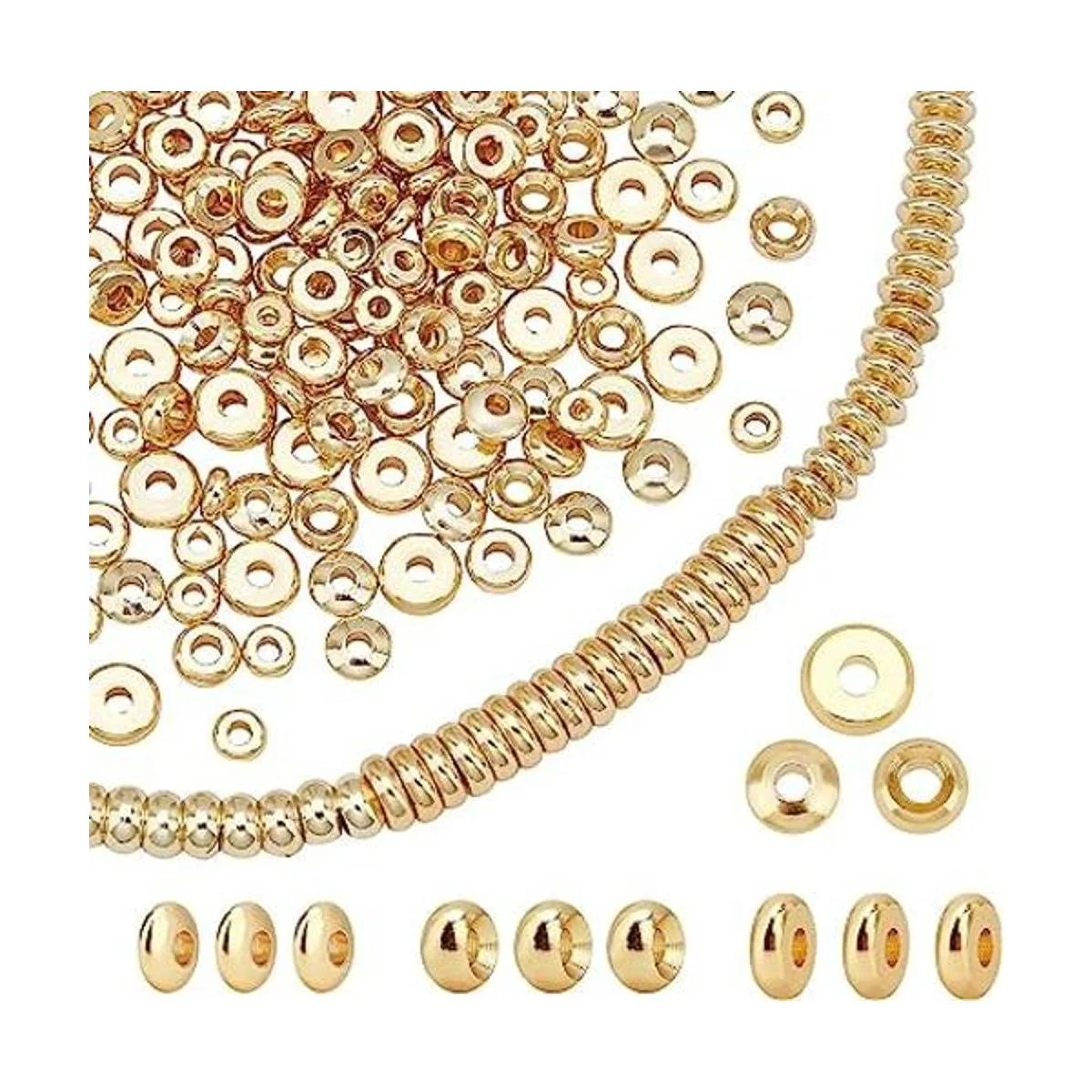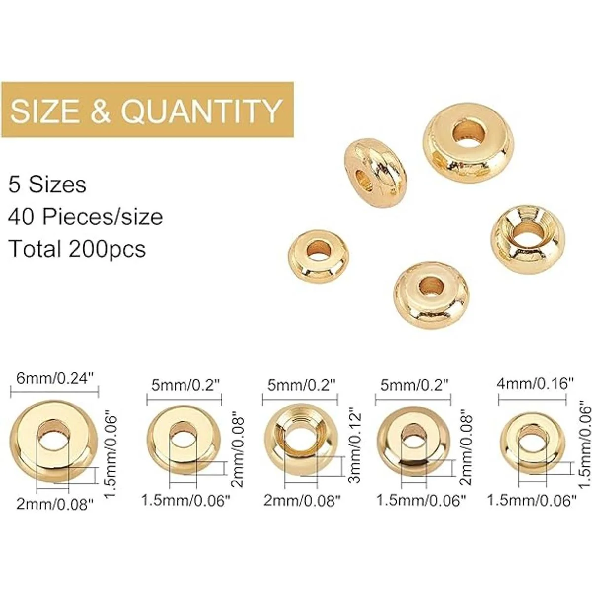 5. Estilo: 0.157 x 0.059 in, 0.197 x 0.079 in, 0.197 x 0.079 in, 0.197 x 0.118 in, 0.236 x 0.059 in, agujero: 1,5 0.079 in. Estas cuentas son de tamaño perfecto como cuentas espaciadoras. Cantidad: 40 piezas de cada tamaño, alrededor de 200 cuentas espaciadoras de disco de metal en total, suficientes para satisfacer tus diversas necesidades para tus proyectos de joyería.