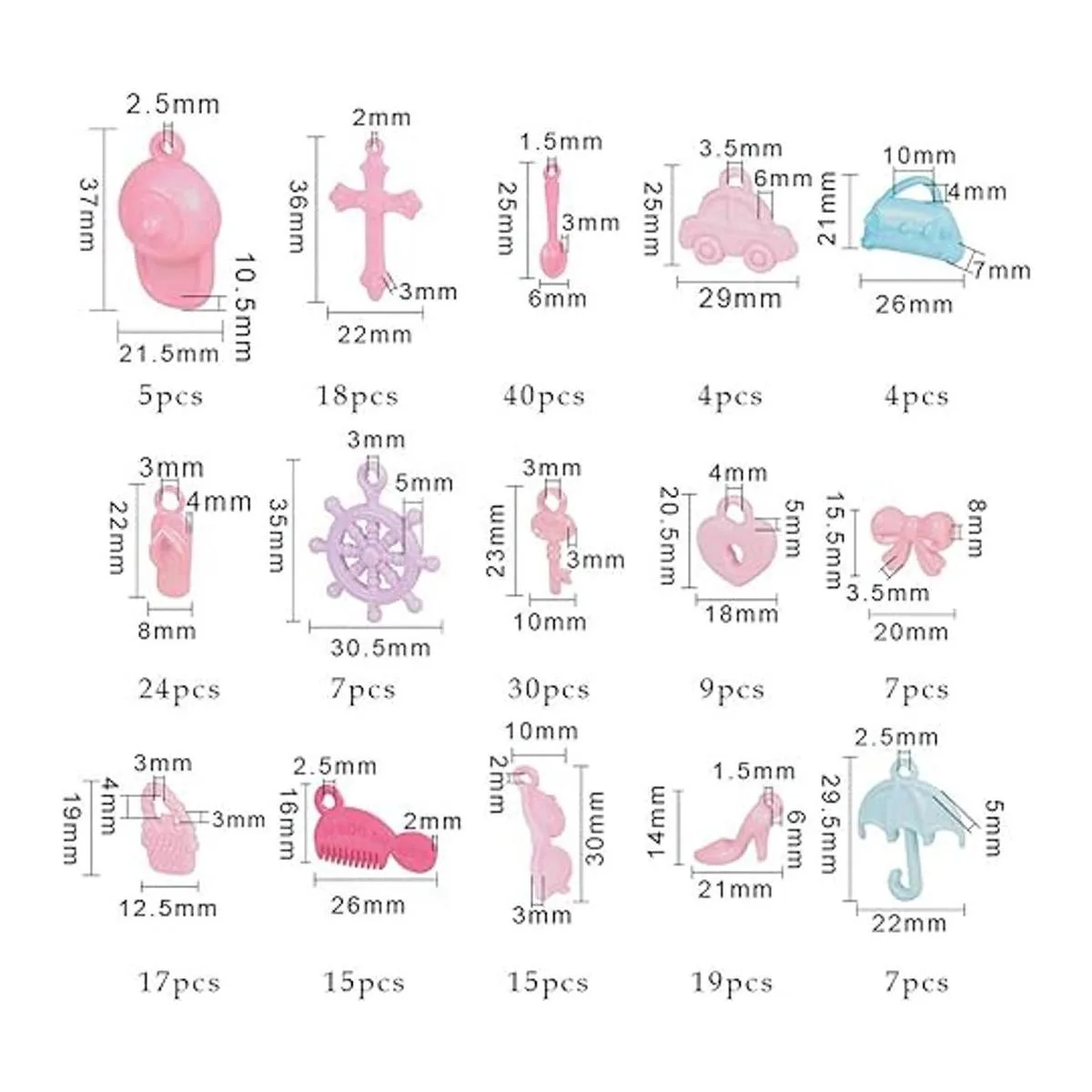 15 estilos disponibles: llave, cruz, paraguas, cerradura de corazón, coche, chanclas, rueda náutica, peine, bolsa, zapatos de tacón alto, cuchara, lazo, sombrero, cesta, gafas, todo apto para collares y pulseras de bricolaje.