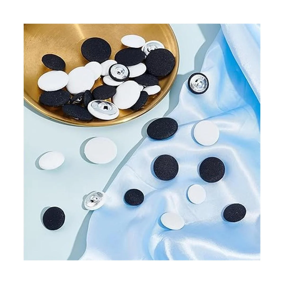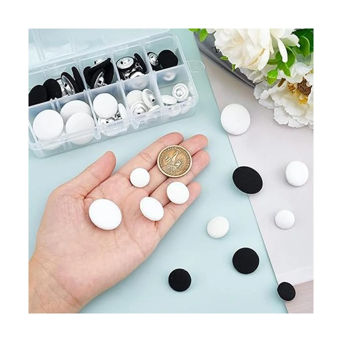 El paquete incluye: el paquete viene con 48 botones en colores blanco y negro, cantidad suficiente con lo clásico que puede satisfacer su uso prolongado.