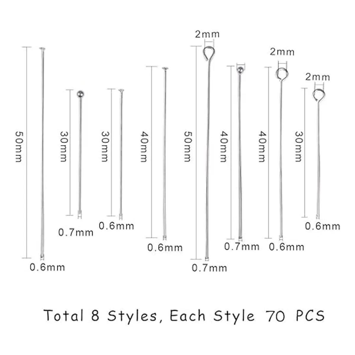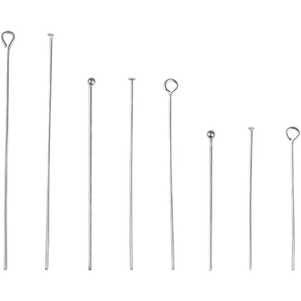Detalles del tamaño: pin de ojo: longitud de 1.181 in/1.575 in/1.969 in, pin de 0.024 in/0.028 in calibre 23/21, agujero de 0.079 in; pines de cabeza: longitud de 1.181 in/1.575 in, pines de cabeza de bola: 1.181 in/1.575 in; pines de metal para hacer joyas a granel.