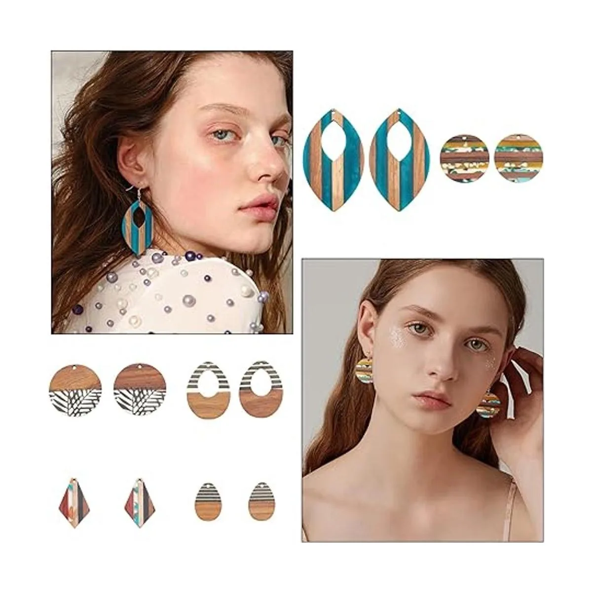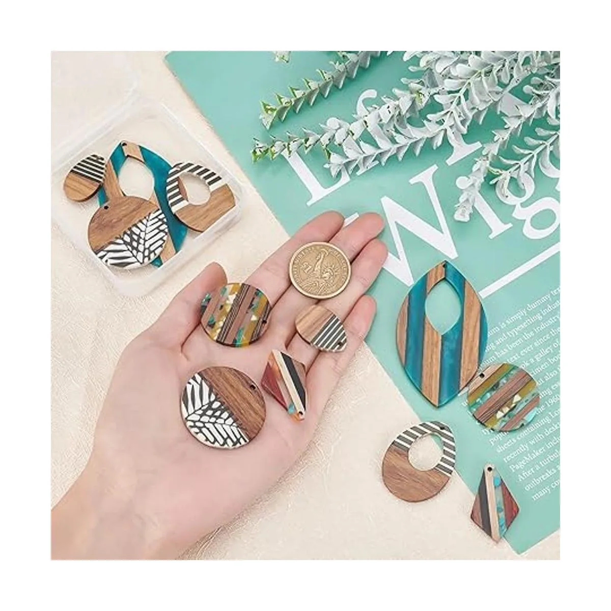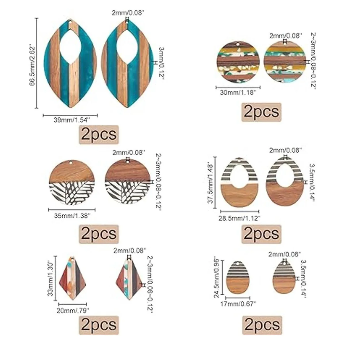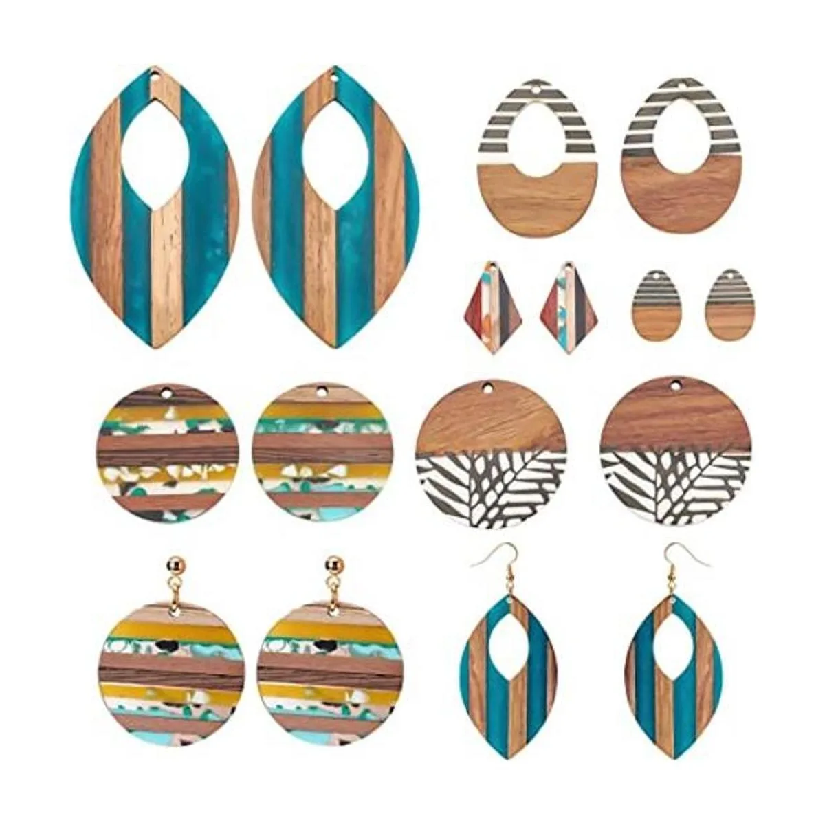 PH PandaHall 6 estilos de colgantes de madera de resina, 12 aretes vintage de nogal, aretes planos redondos de madera, aretes de lágrima, collar de hoja de rombo para hacer joyas, manualidades de bricolaje opaco
