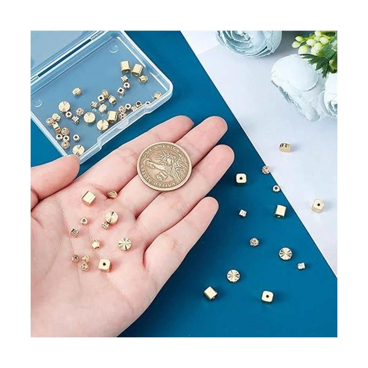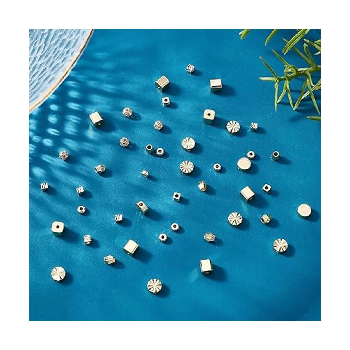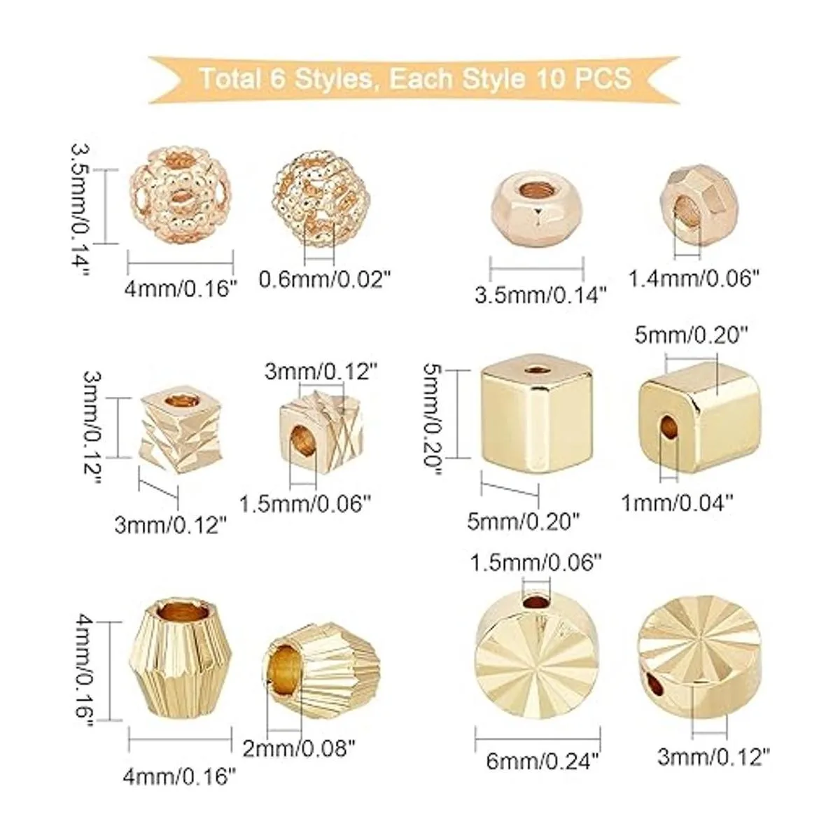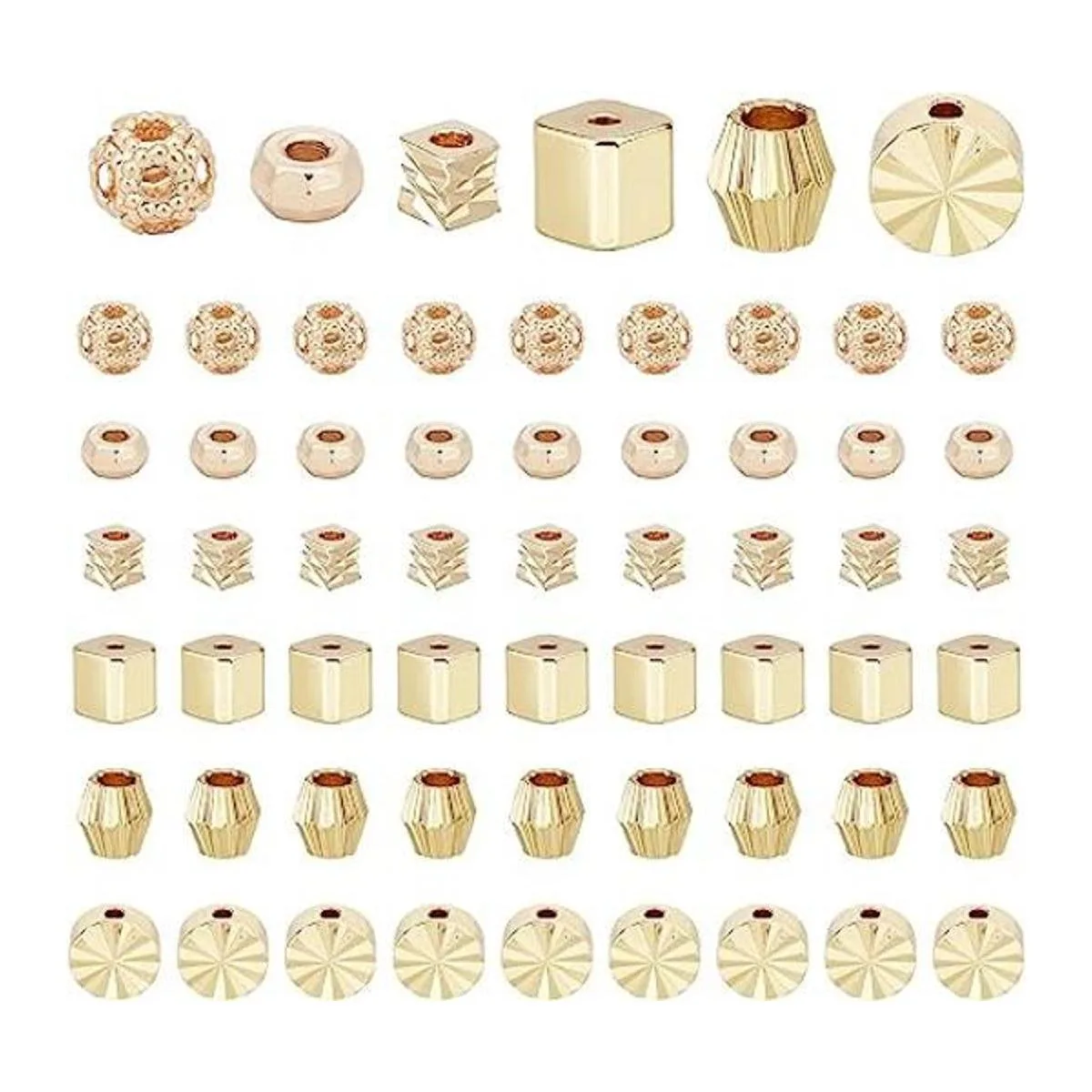 PH PandaHall 6 estilos de cuentas espaciadoras, 60 cuentas chapadas en oro de 14 quilates de latón plano redondo cubo bicono facetado, cuentas sueltas de metal para hacer joyas hechas a mano, manualidades de abalorios