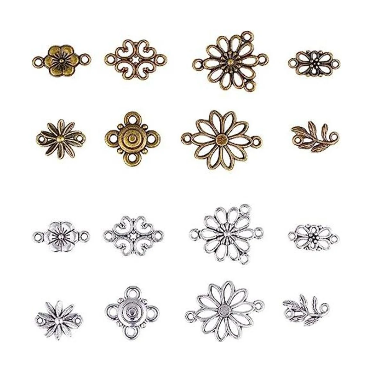 PH PandaHall 80 dijes de conector de flores, 8 estilos de 2 colores, dijes de hojas de flores de doble agujero, conector de cuentas de margaritas para el día de San Valentín, primavera, aretes, collares, pulseras