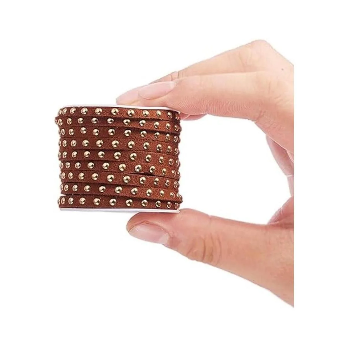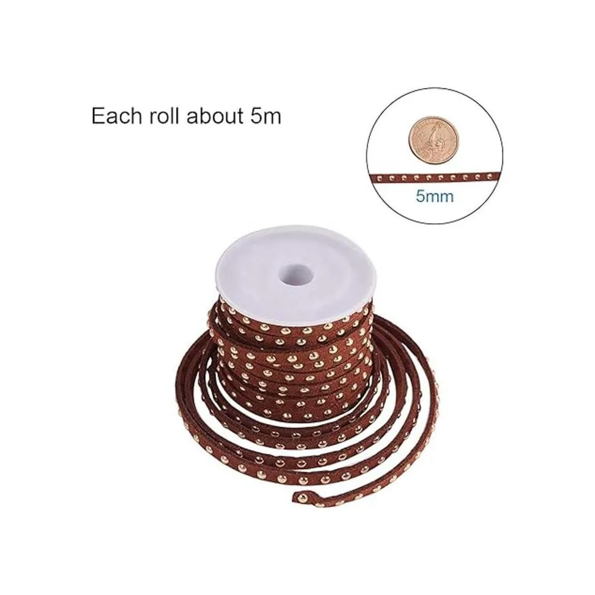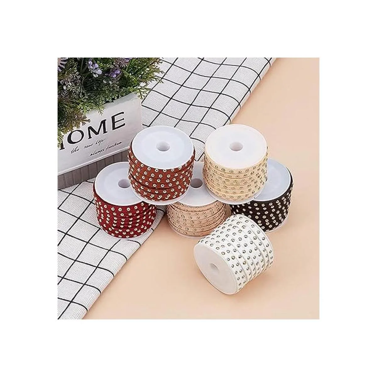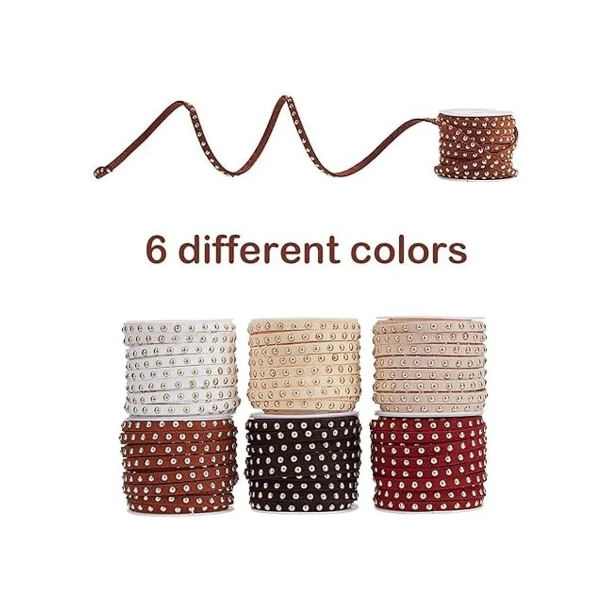 Variación de 6 colores: el paquete incluye 6 rollos de cordón de piel sintética tachonada en 6 colores: trigo, gasa de limón, blanco, rojo oscuro, marrón coco y siena. Aproximadamente 0.197 in de ancho, 8.2 ft de grosor, 16.4 ft de rollo. 15 yardas en total.