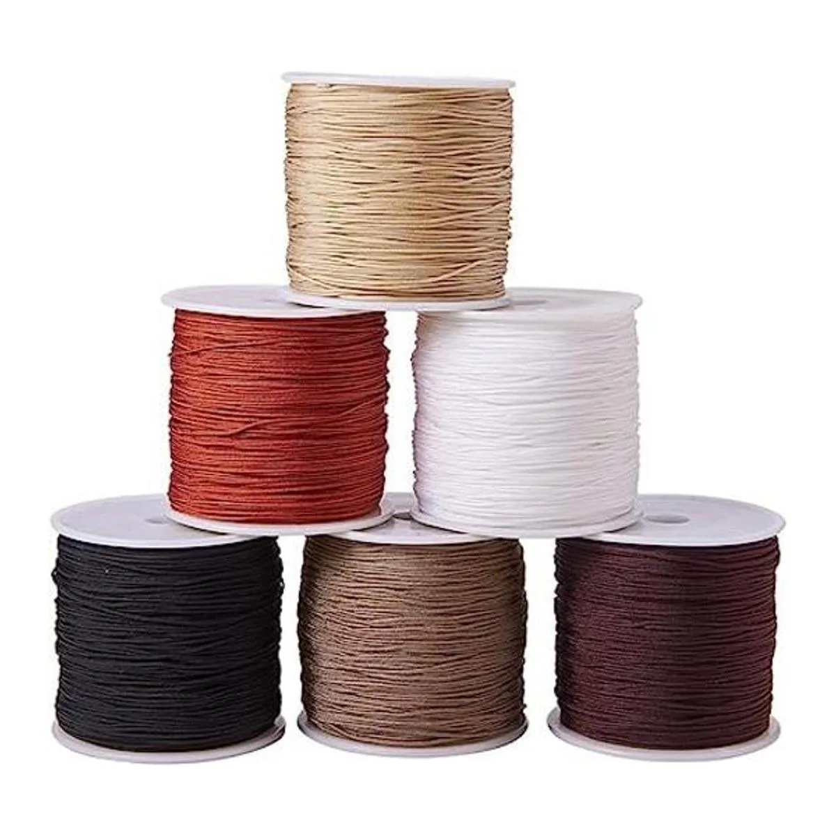 El paquete incluye: 6 rollos de cordón de 100 yardas en 6 colores: marrón coco, negro, madera burlywood, marrón sillín, camello, blanco; vibrante y suficiente para tus proyectos, ideal para collares de mala anudados y pulseras, aretes de borla, bolsos.