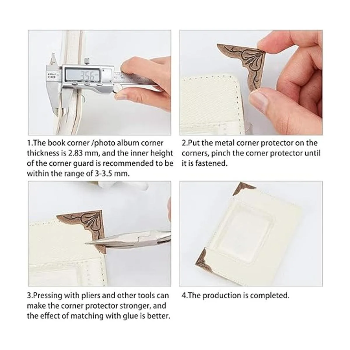 Fácil de instalar: los protectores de esquina triangulares son ligeros, instalación práctica, solo tienes que elegir el grosor adecuado del ángulo de libro de metal insertado en la cubierta del libro de mano, y luego presionar el ángulo de metal del libro.