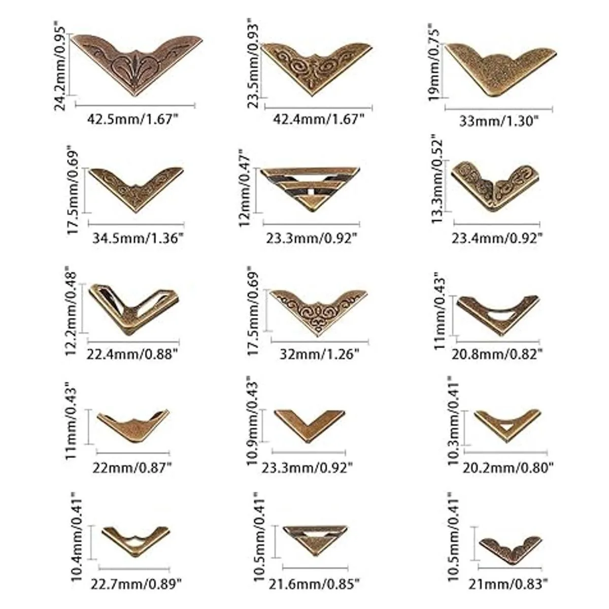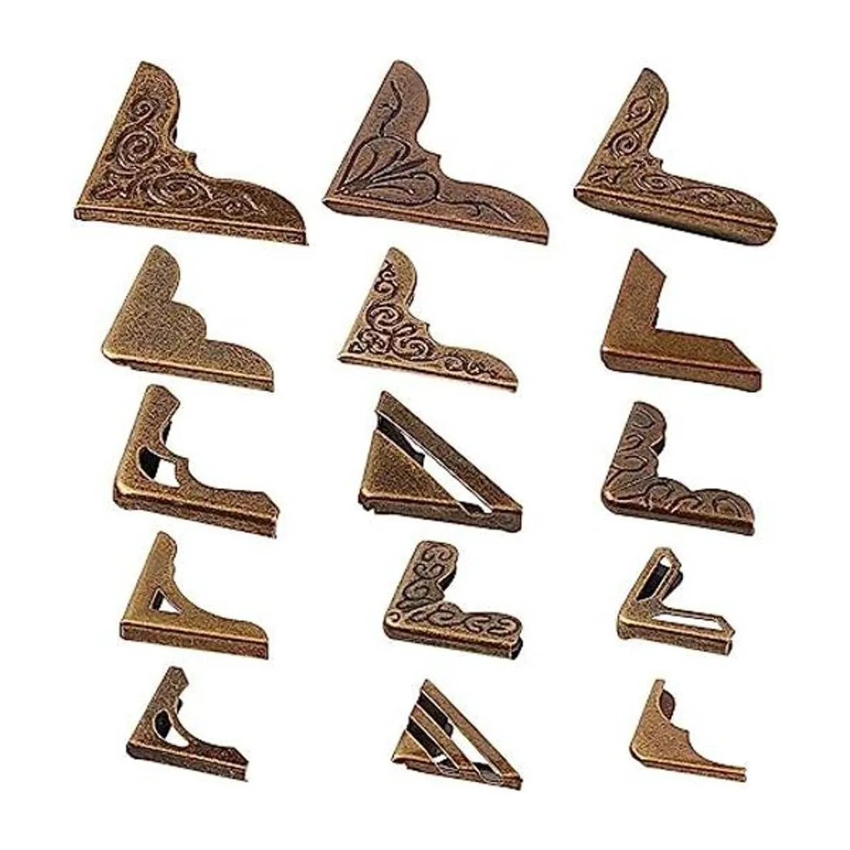 PH PandaHall Esquinas de libro, 60 unidades de 15 estilos de protectores de esquina de hierro, cubierta de metal para diarios de chatarra, caja de joyería, libro de álbumes de recortes, menús, muebles, bronce antiguo
