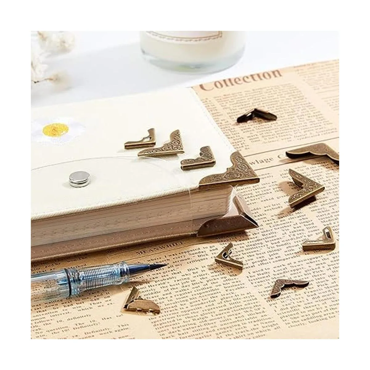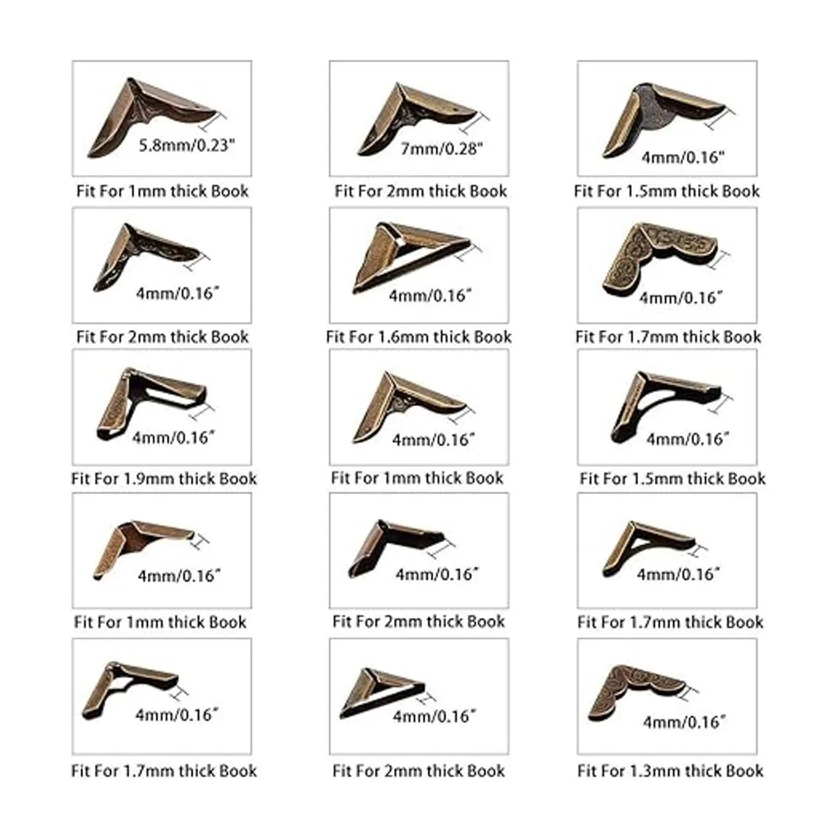 15 estilos disponibles: el paquete incluye 60 protectores de esquina de metal en 15 estilos, cada estilo 4 piezas; puede satisfacer tus diferentes necesidades de bricolaje. Todas las esquinas de los libros están empaquetadas en una caja de plástico transparente para un fácil almacenamiento.
