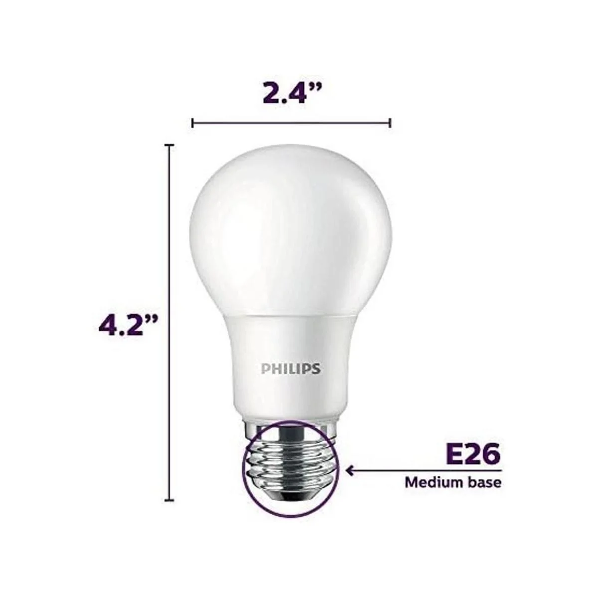 Las bombillas LED Philips A19 proporcionan 800 lúmenes de luz blanca suave, equivalente a incandescentes de 60 vatios con un 80 menos de consumo de energía. Estas bombillas se ajustan a accesorios estándar de base media E26 con el aspecto y la sensación de una bombilla clásica. No apto para uso con productos Philips HUE