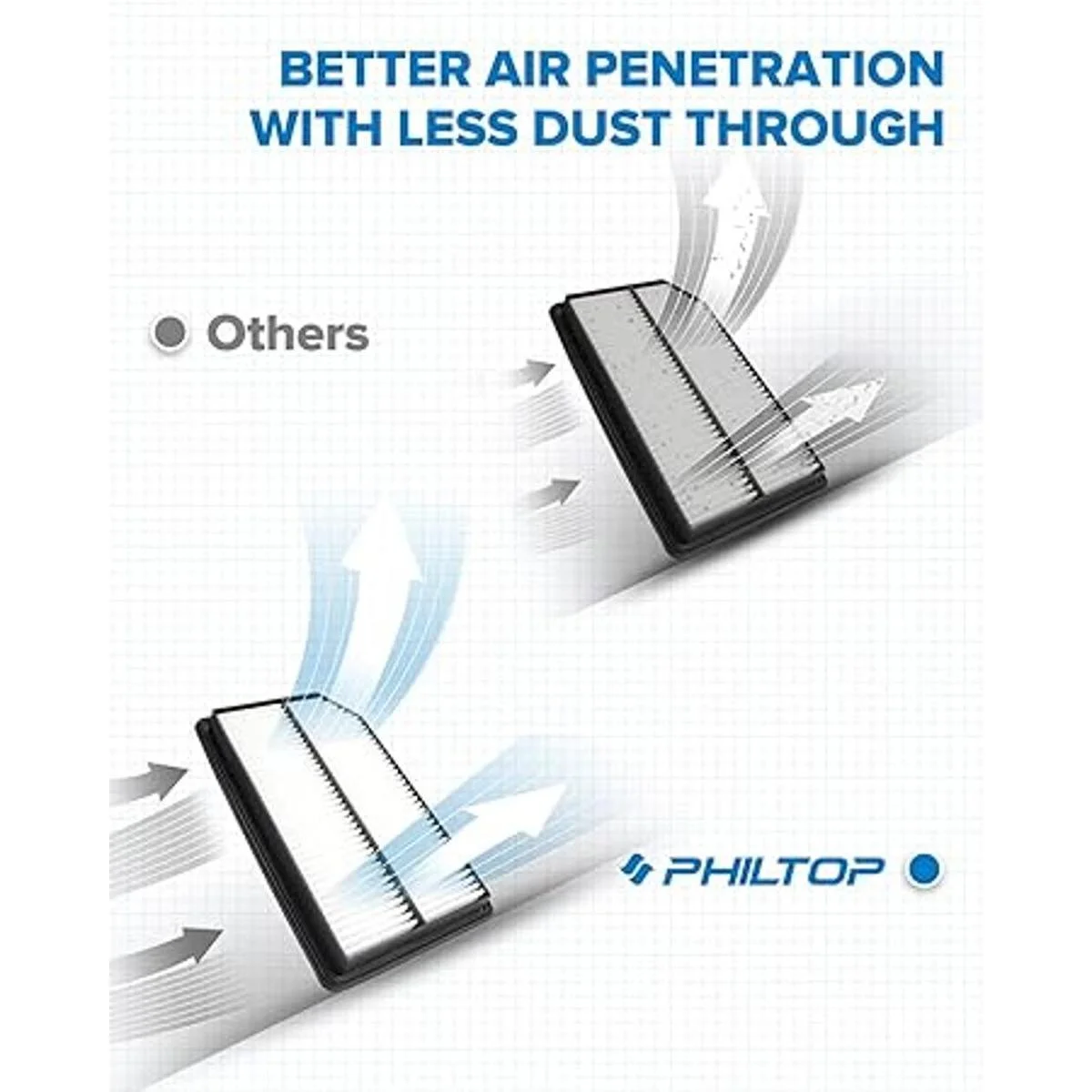 Rendimiento mejorado: el filtro de aire para motor de coche PHILTOP proporciona aire limpio a tu motor para evitar que el polvo y las impurezas entren en el motor y afecten la eficiencia de combustión. Di adiós a la aceleración retrasada y al kilometraje de gas menos que el promedio
