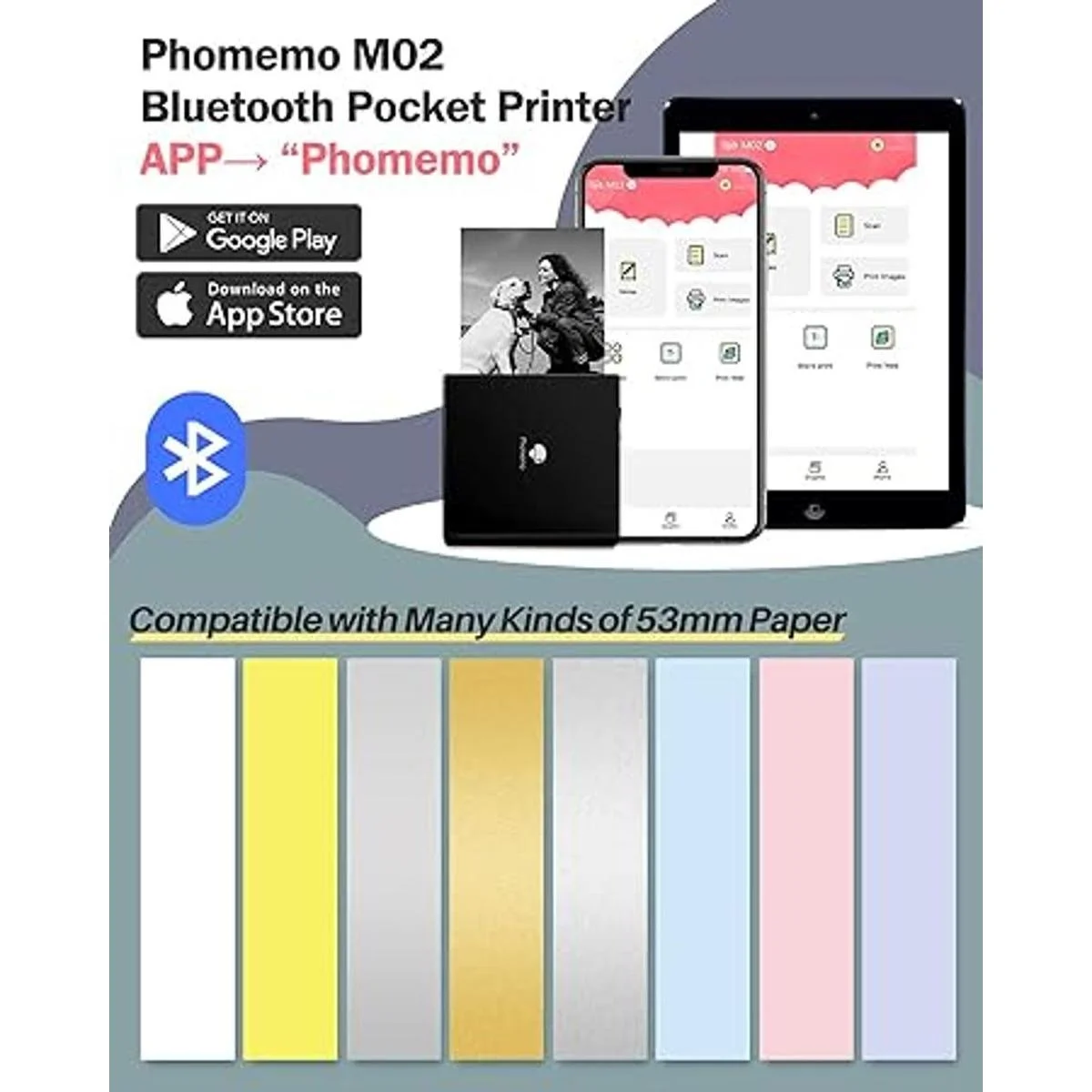 Contenido del paquete: 1 impresora de bolsillo para fotos Phomemo Black M02, 1 papel adhesivo transparente de 2.087 in negro sobre blanco, transparente. 1 cable micro USB.