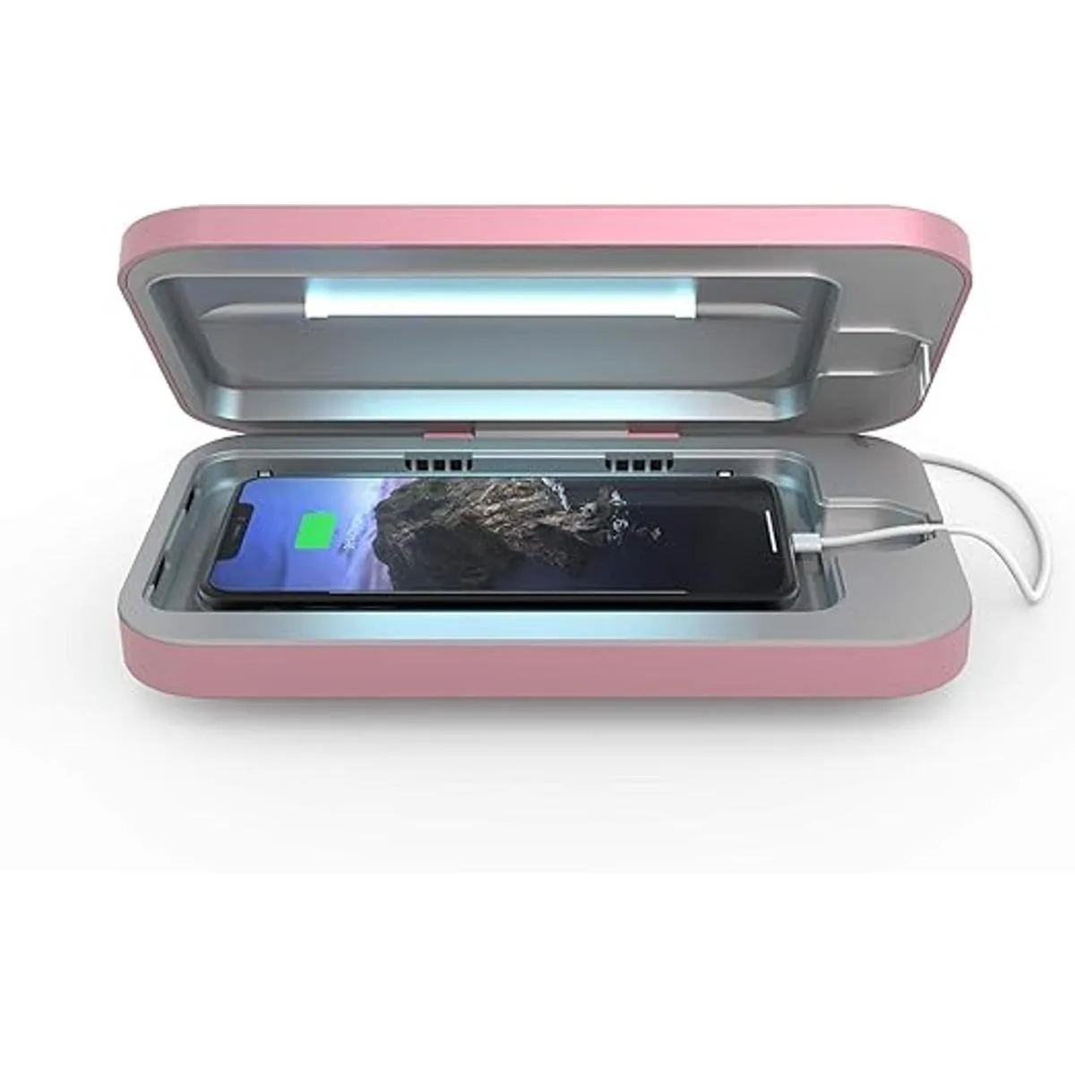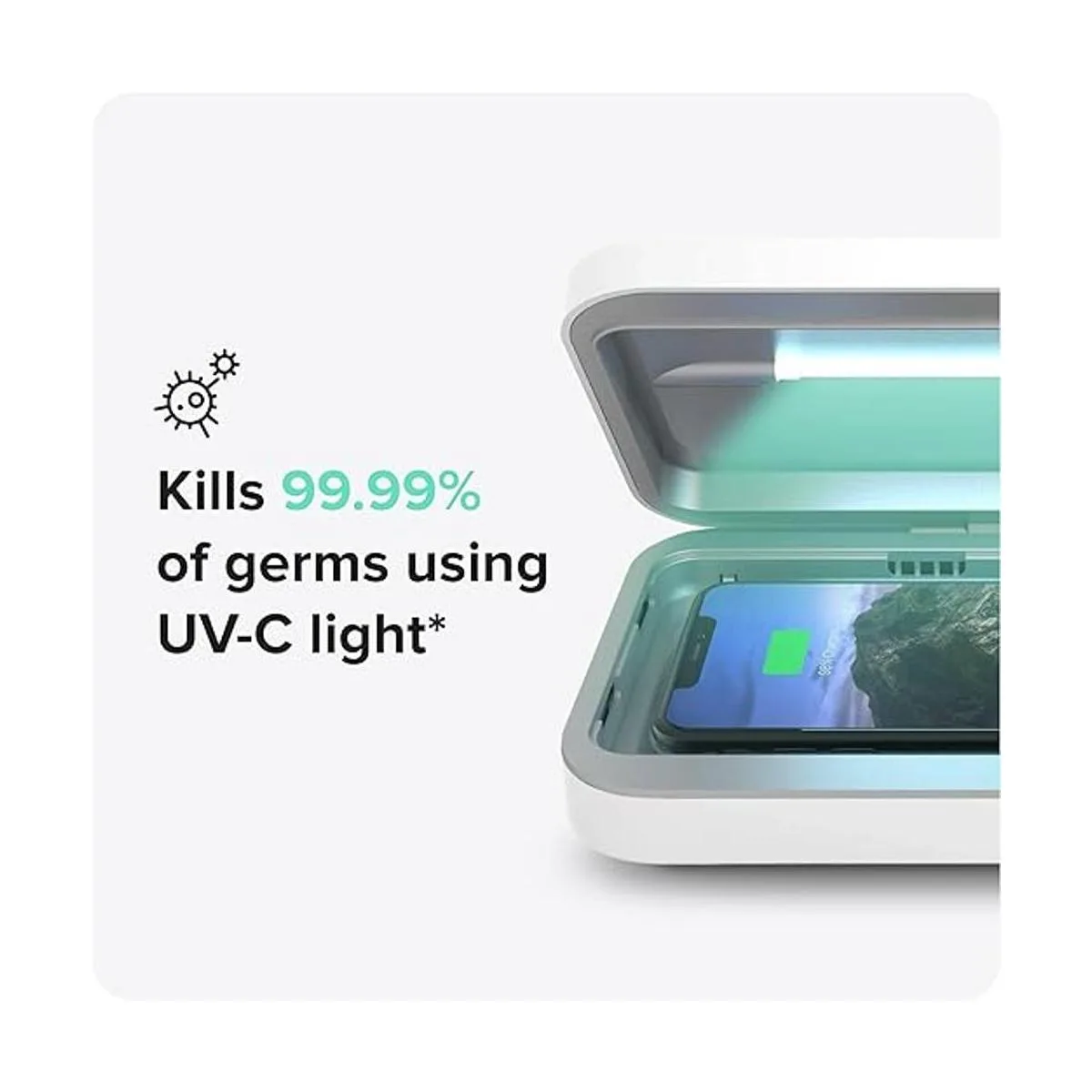 Mata el 99.99 de las bacterias con luz UV. Nuestro diseño patentado es el único dispositivo que puede desinfectar completamente todo tu teléfono. Sentado en una placa transparente UV, y rodeado por una luz UVC germicida científicamente probada y un interior reflectante, PhoneSoap mata el 99.99 de todas las bacterias de tu teléfono.